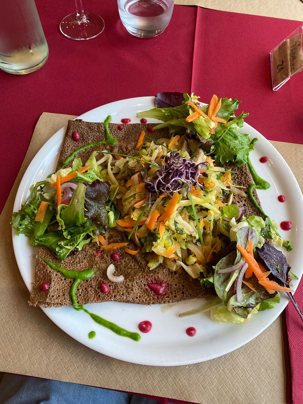 We felt so lucky to have found this lovely crêperie open on a cold January day in Montsoreau when most of the other local restaurants were shut for the month. And all the more so that this was potentially the most vegan friendly of them all. As a vegan in France I am usually content with a good plate of chips or a green salad and was prepared for that today. But we had the warmest welcome from the owner, who fully understood what being vegan means, and who herself is vegetarian. The vegan option was incredible - a crepe with no dairy (who knew?) topped with a special local mushroom called a “galipette” stuffed with a seasonable vegetable medley stir fry with beautiful garnishes of micro-greens and various fresh salad leaves. If you are travelling with non vegans, the menu is extensive and apparently excellent according to my husband. We felt so welcome, and the service and food were outstanding. Go here if you are in the area and want something freshly cooked, delicious and vegan!