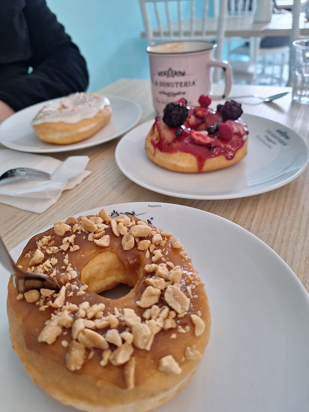 Lecker Cappuccino, Erduss- und Karameldonut. Natürlich vegan, Klasse! …