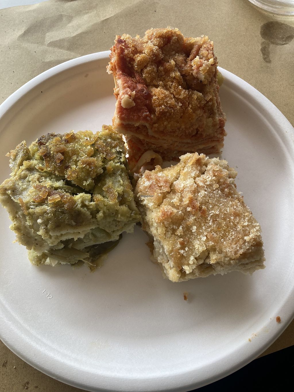 Pros: Panino con cotoletta di seitan, Crostatine con marmellata/cioccolata, Lasagna
