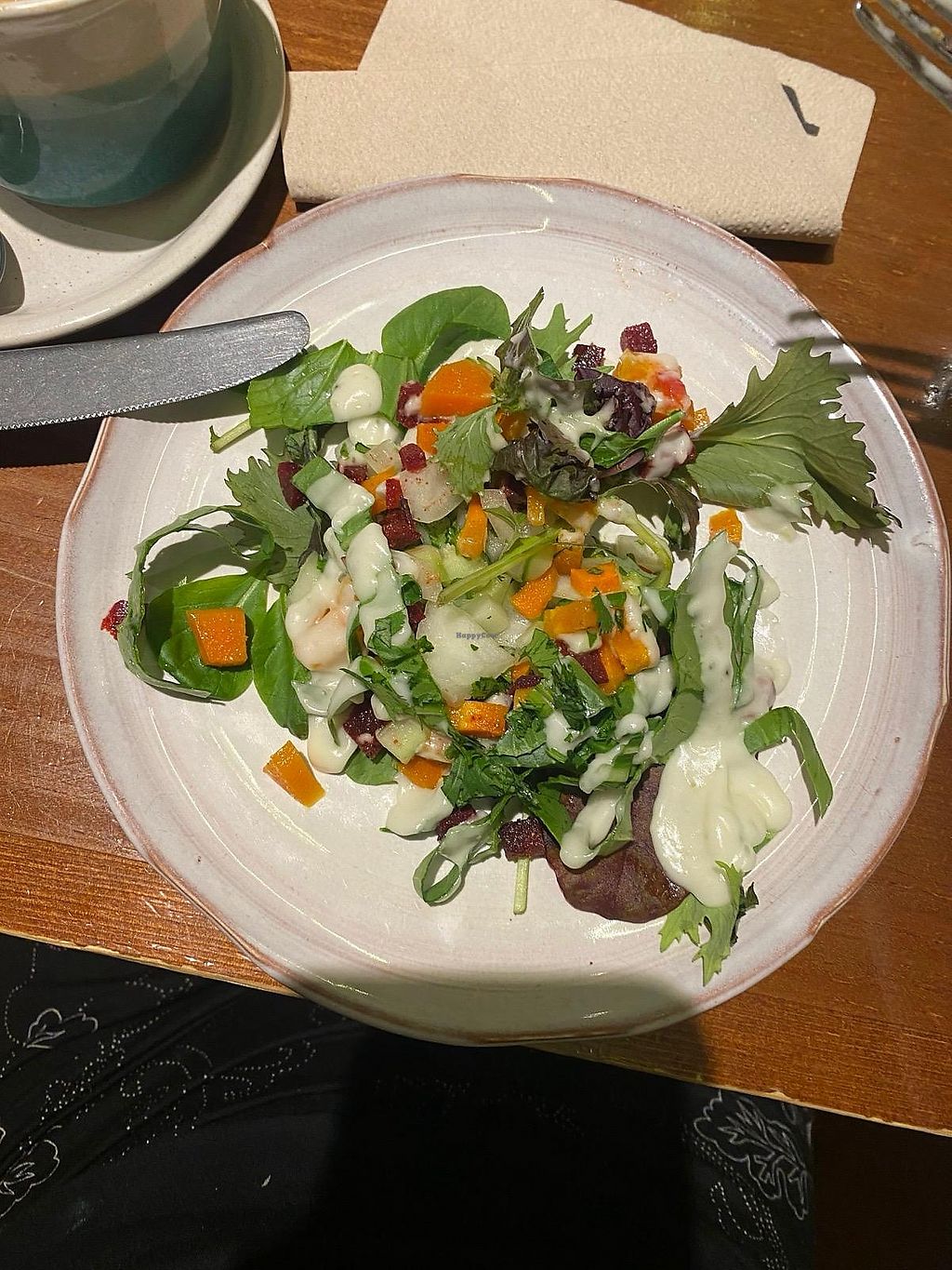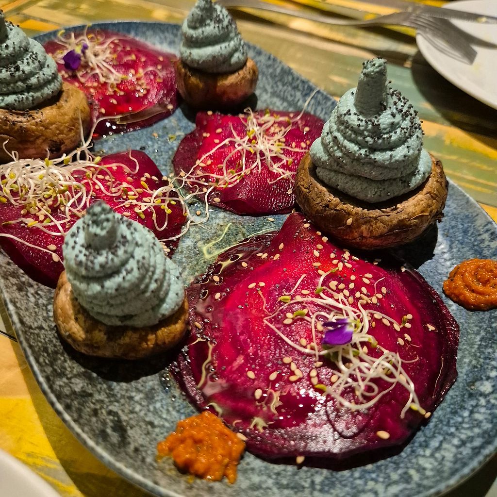 Lo encontré de repente, caminando sin rumbo fijo. Y me encantó. Cómo raviolis de remolacha (casi raw) Digo casi, porque de acompañamiento tenía champiñones cocinados (lástima). Pero, sin embargo, el plato delicioso.