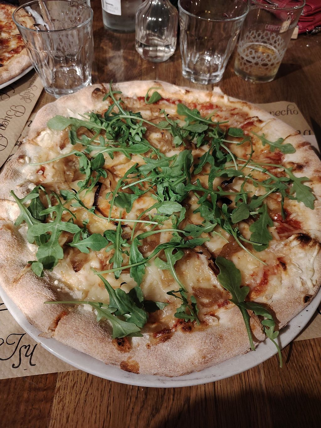 Pizza con mozzarella vegana, aceitunas, cebolla caramelizada, pimiento…