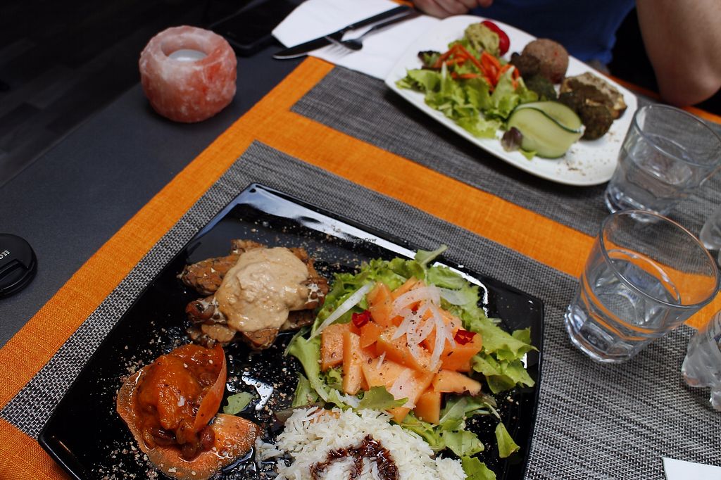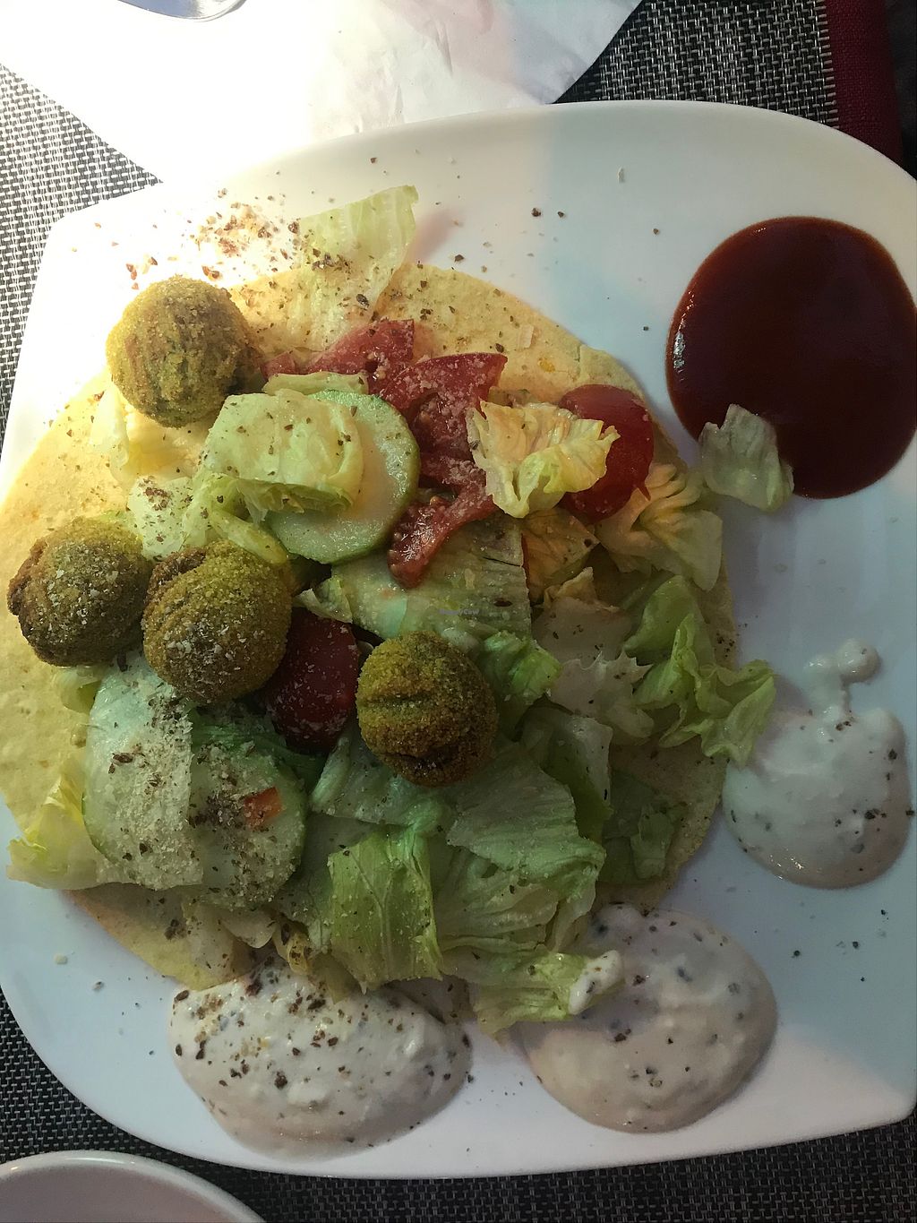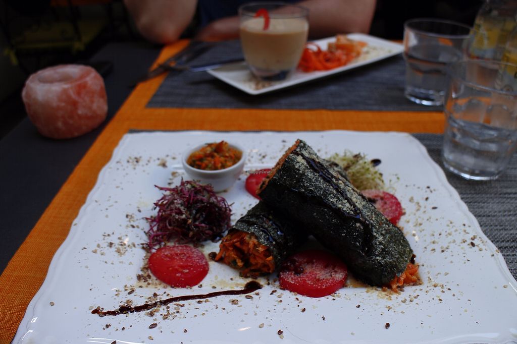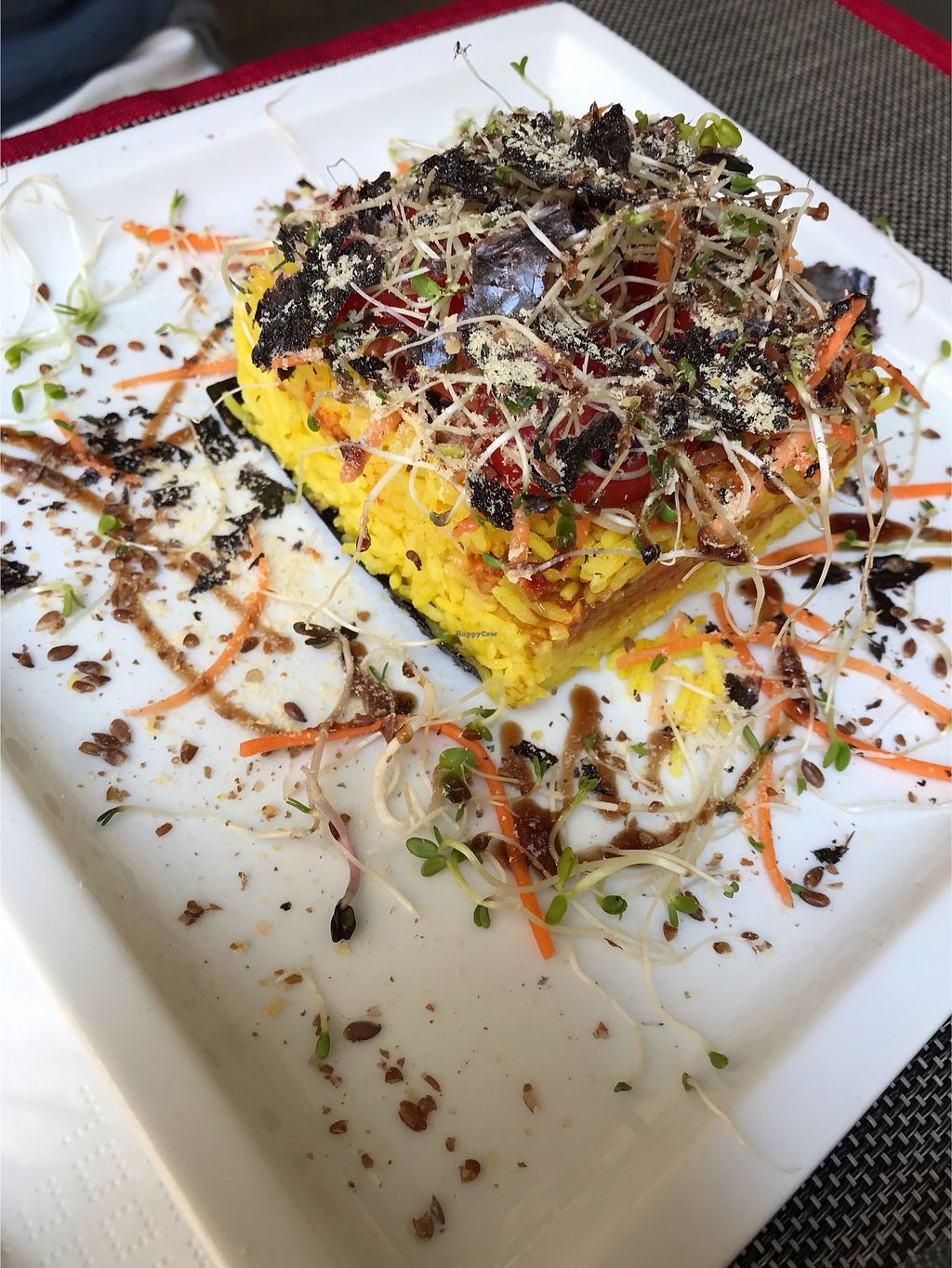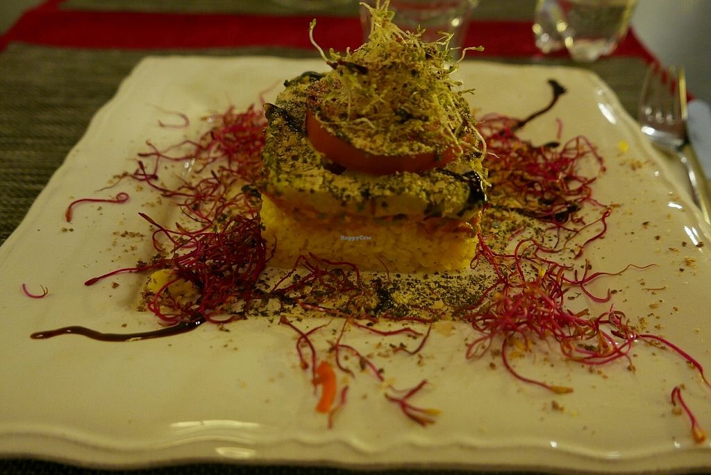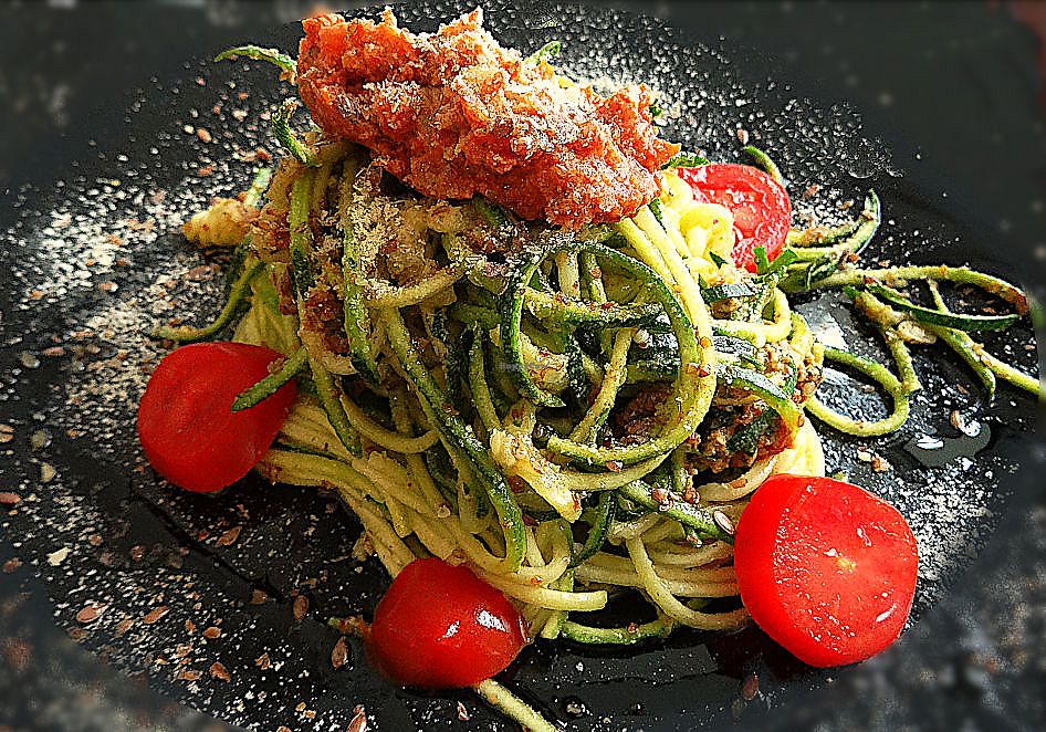 Spaghettini di zucchine con pesto di pinoli, pomodori e basilico.