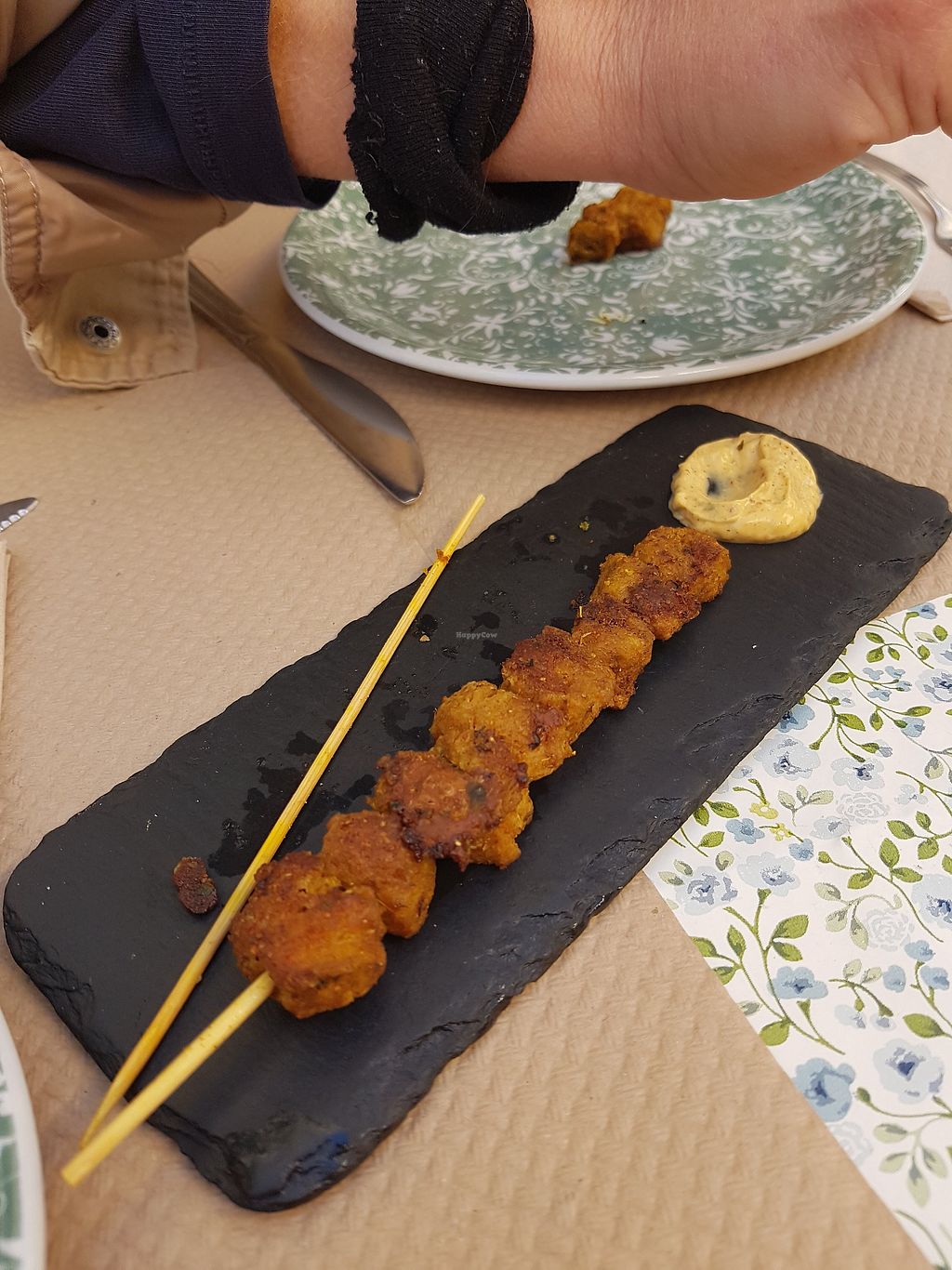 We took the menu of the day, three different choices and we took them all. I had some kind of beef made with seitan, potatoes and salad. Food was ok but not specifically good. It was also almost cold. Very friendly waitress, nice atmosphere. Not possibility to eat outside.