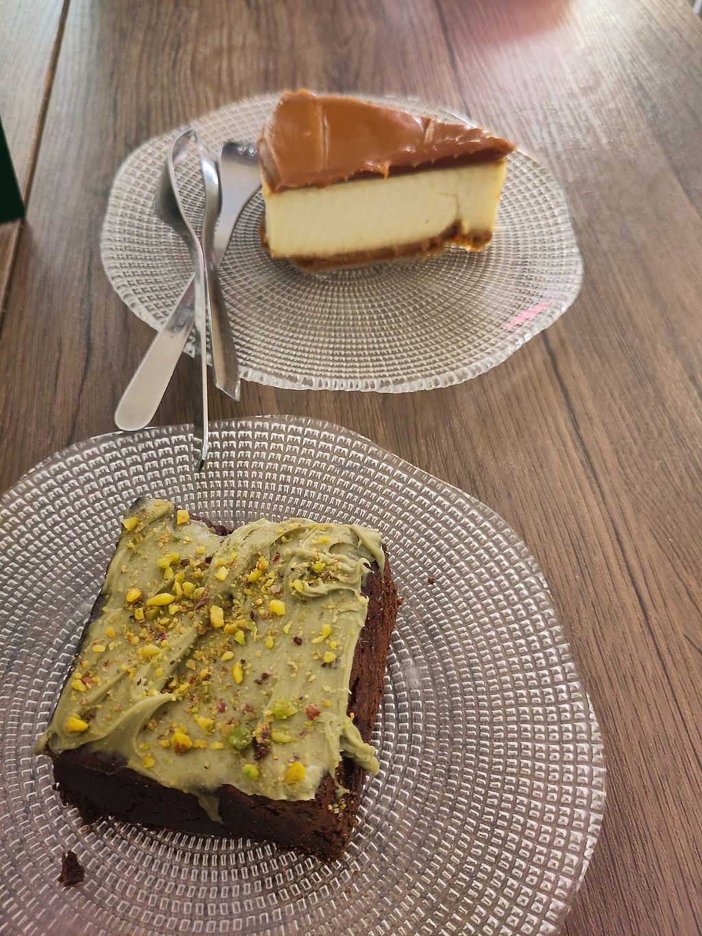 Brownie de pistacho y chocolate y tarta de queso de lotus