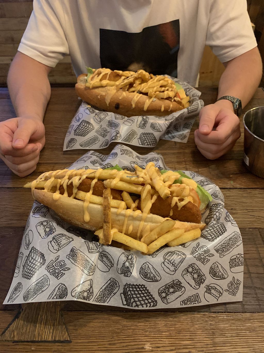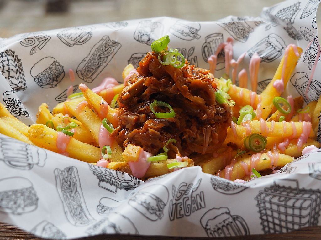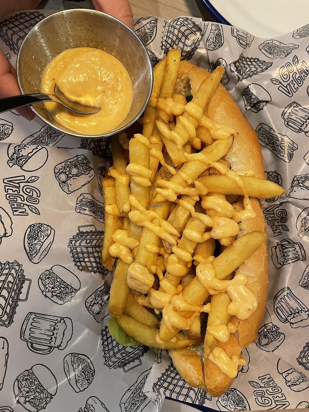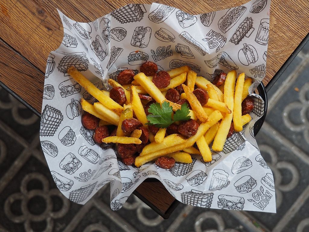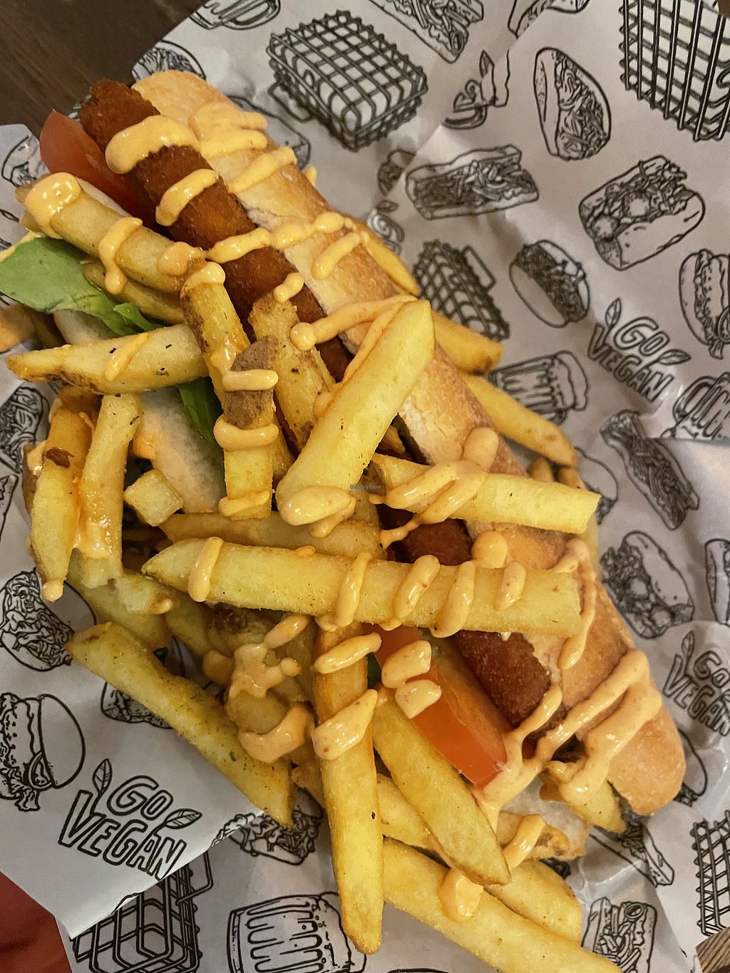 Serves all-vegan street food from the world, including sandwiches with heura, Beyond Meat, jackfruit, shitake mushrooms, etc. Also has nachos with cheese and banana meat on top; ceviche; Argentinian potatoes with chorizo & chimichurri sauce on top, plus many more. Reported closed April 2024.