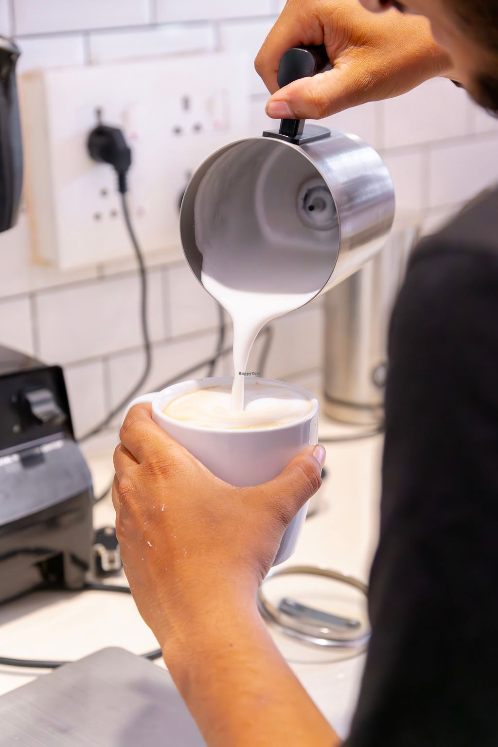 Iced matcha latte with homemade creamy and foamy plant-based mylk. The…