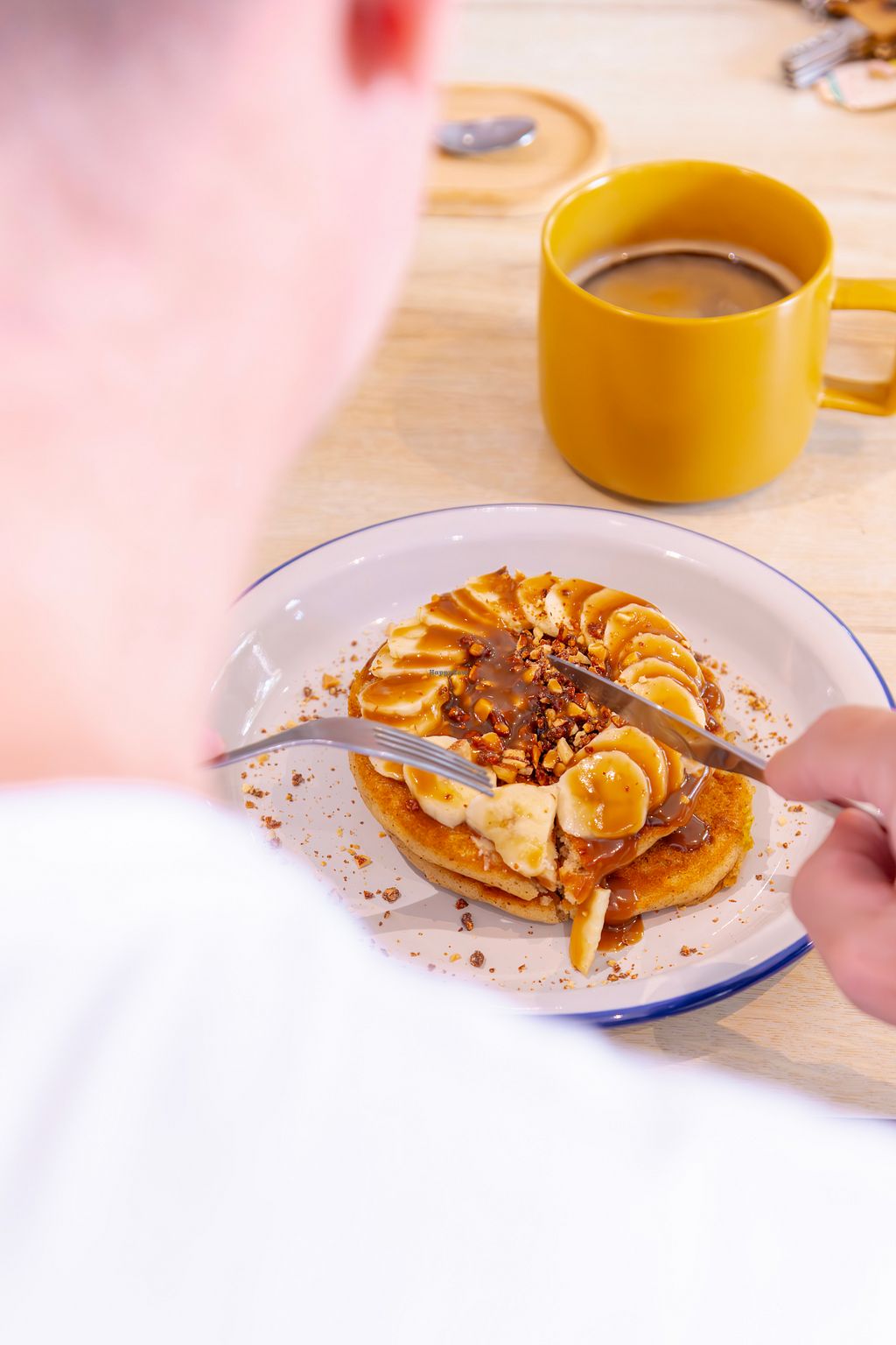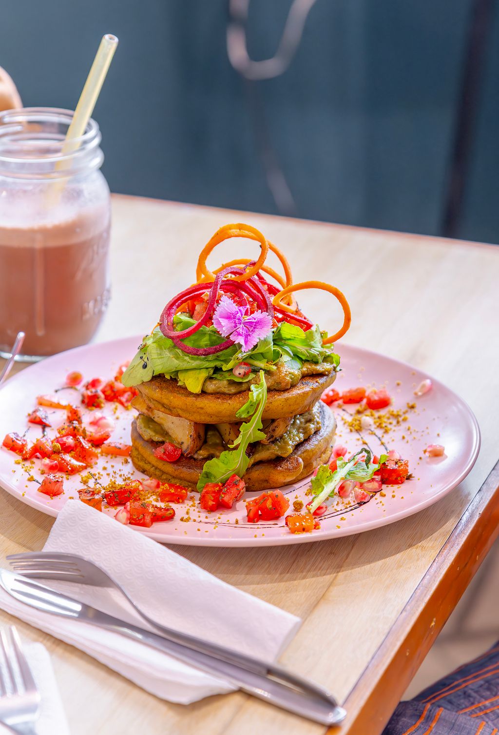 Gluten-free Avocado pancakes, with roasted potatoes, confit tomatoes, …