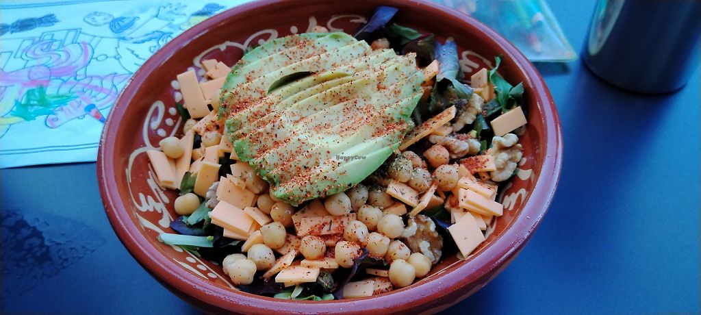 Bowl con quinoa, garbanzos, aguacate, queso vegano, lechuga y frutos s…