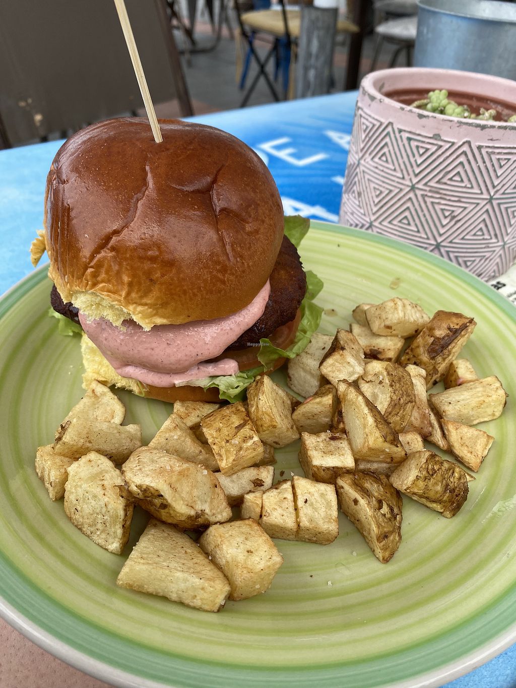Burger without cheese comes with potatoes