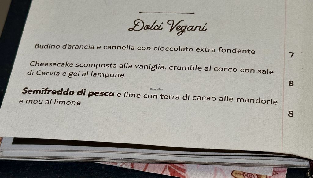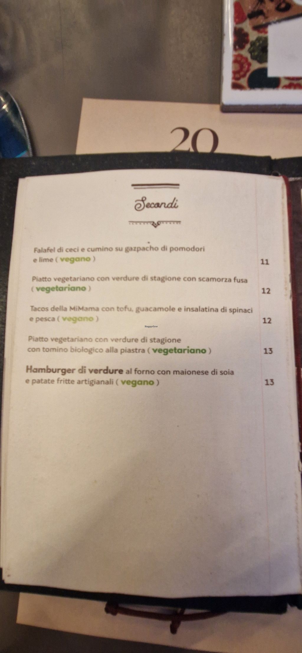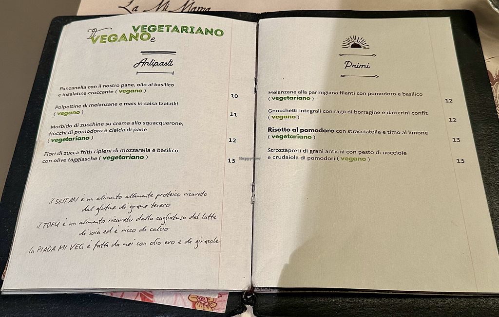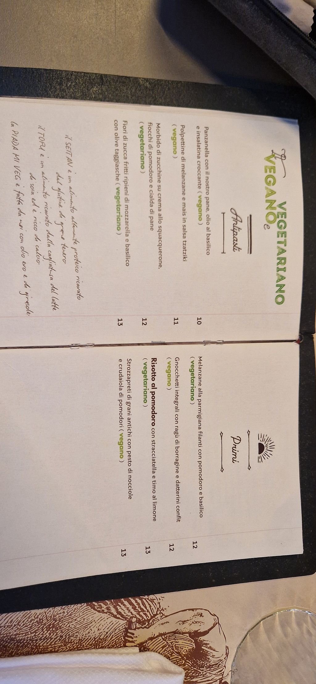 Good vegetarian and vegan dishes. They have both options on their physical menu but in Italian only. There is the English version of the menu on their website.