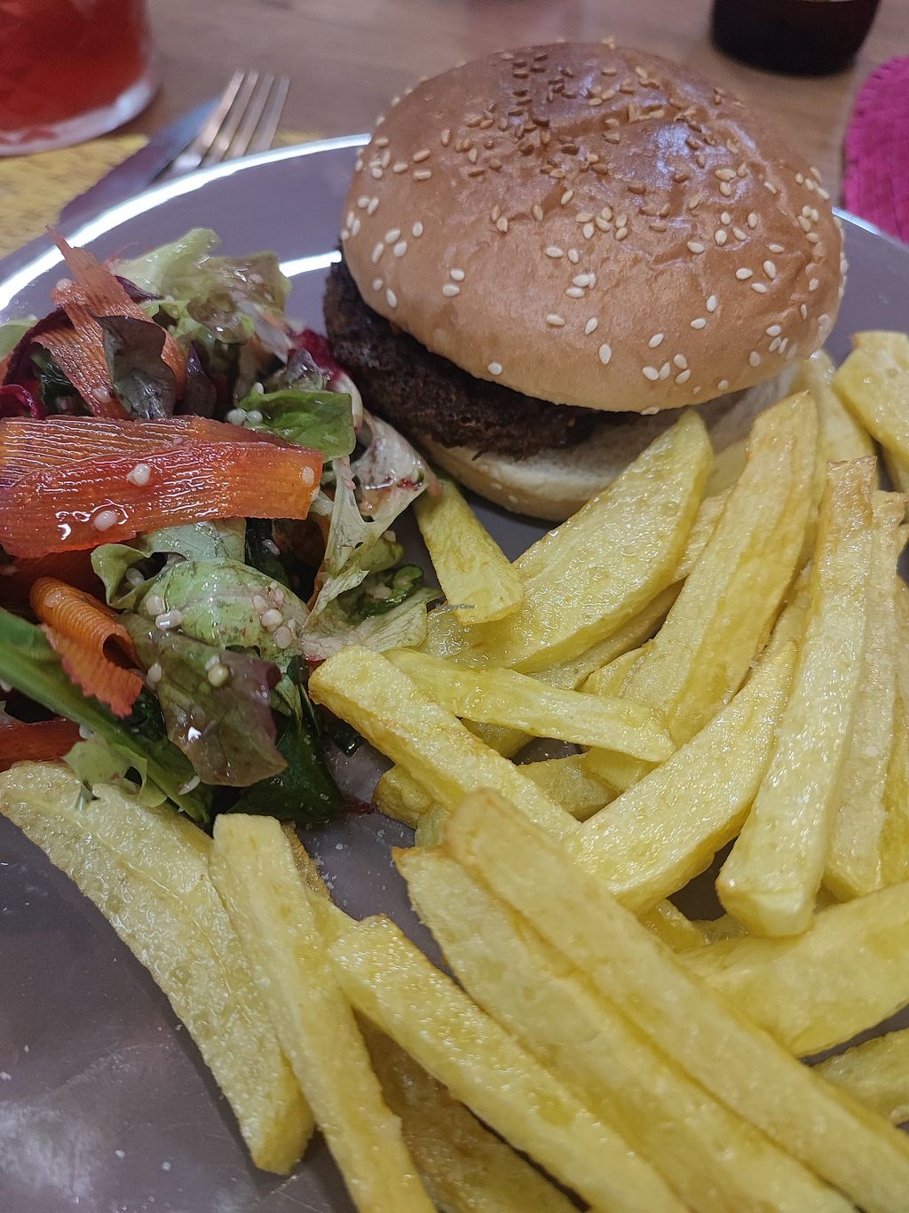 Lugar pequeñito pero muy cuqui, la decoración y el ambiente geniales. Tiene cerveza sin alcohol pero no 0,0, lo cual es un problema para las mamás lactantes. No había hamburguesas veganas, pero fuera de carta había dos platos muy ricos aunque algo picantes, no nos gustó que nos ofreciese dos platos fuera de carta y luego ofreciera 3 a los siguientes, suponemos que fue un despiste.