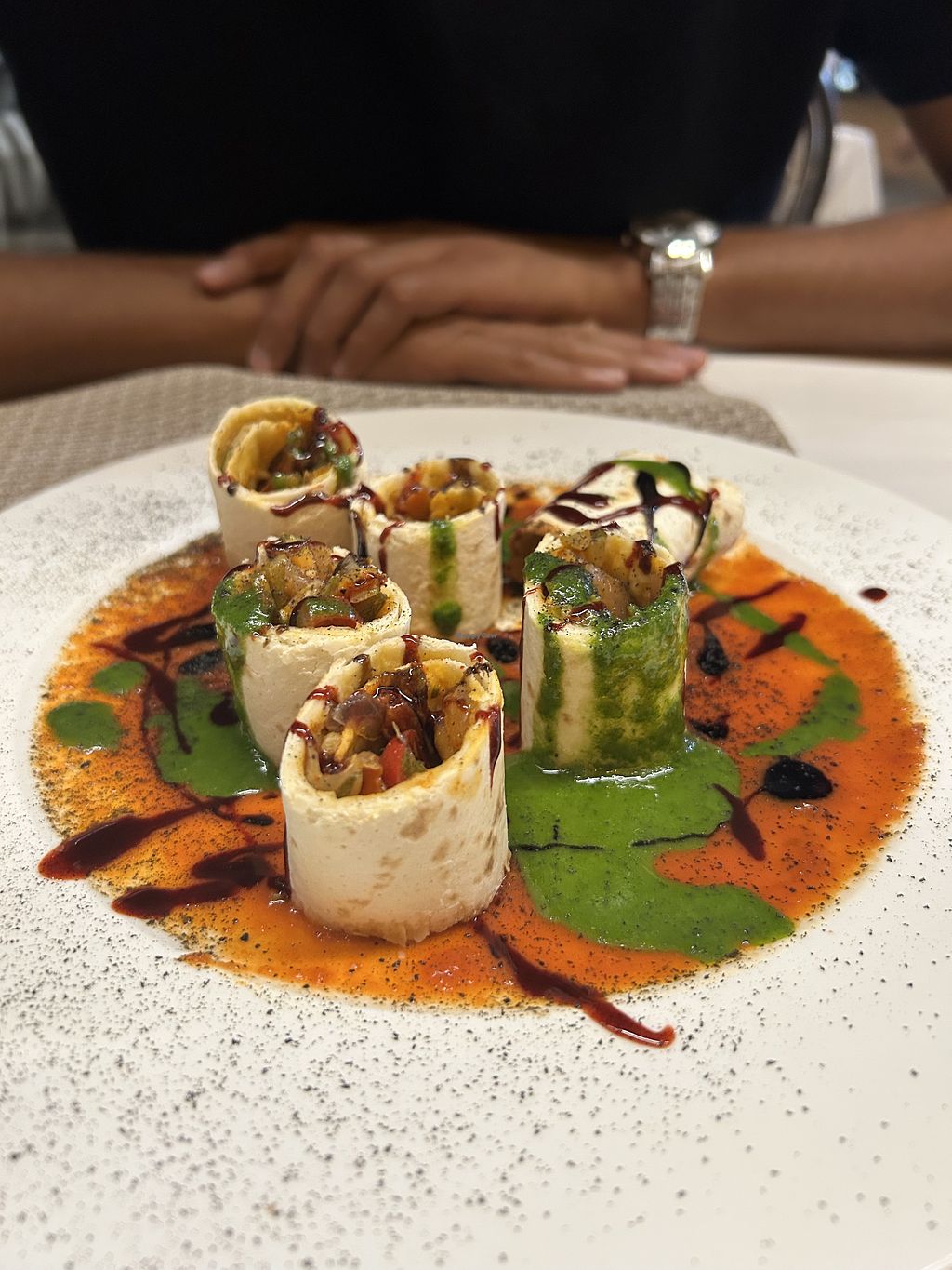 Roll di verdure e funghi su crema di pomodori gialli e pesto di rucola…