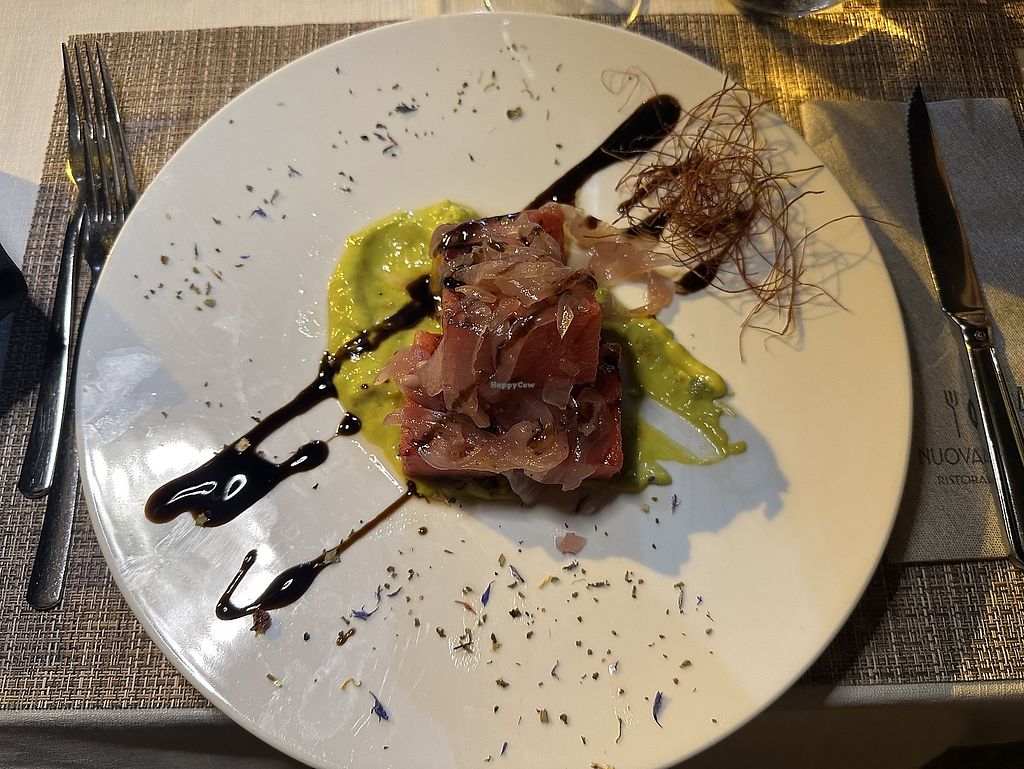 Anguria scottata su letto di guacamole con cipolle caramellate e mando…