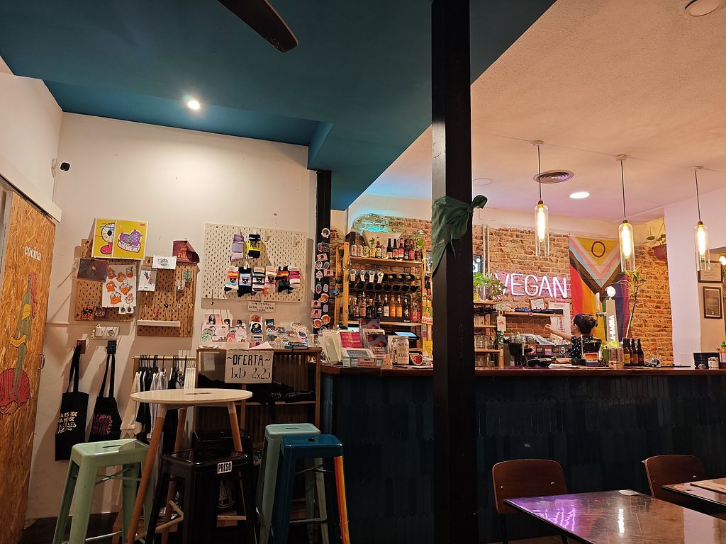 Taberna vegana. 'Vegan queer bar' serving breakfast until 1pm followed by tapas and casual fare like cheesy nachos, wrap with fries, breaded seitan, croquettes, chorizo, burger, chocolate cake, daily soup, and changing specials. Uses vegan cheese. Anarchist atmosphere with posters and murals on the walls. Formerly known as Bar Kunin. Open Mon 13:00-17:00, Tue-Sat 13:00-00:00, Sun 13:00-17:00. Kitchen closes at 11.00pm.