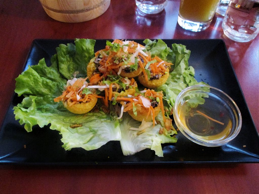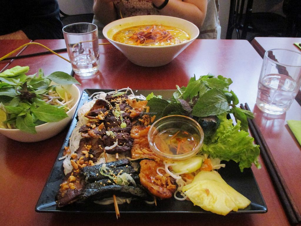4 skewers with different flavours and fresh salad and fresh tasty herb…