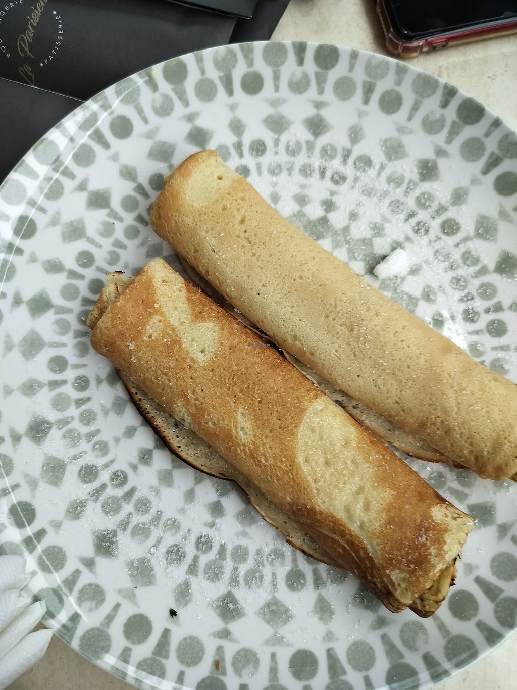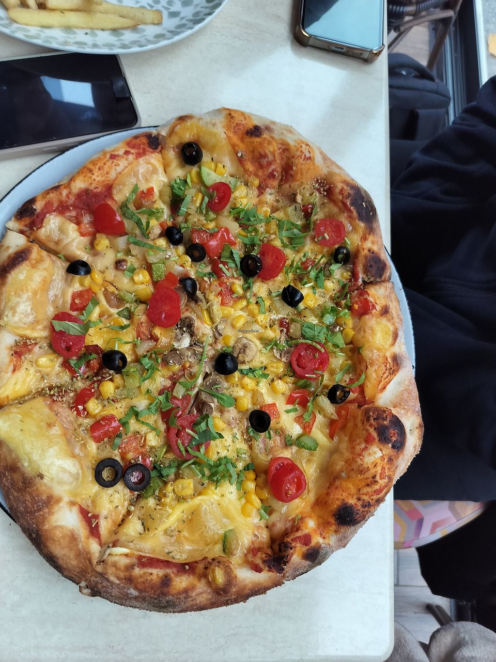 The place offers a few vegan options. We ordered a burger, pizza (with vegan cheese), and lemon and sugar crepes.