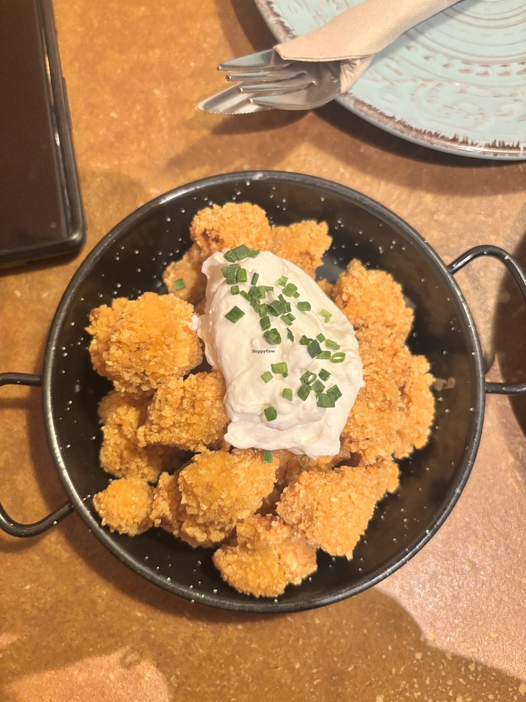Cute spot with fun art on the walls, a kind server, and crisp, fresh house wine. We ordered the cauliflower popcorn, truffle tortilla, croquettes, and the almond lemon cake. The cake was a hit—light, fresh, and the cream was dreamy. The truffle tortilla was also great: full of flavor and nicely moist, which isn’t always the case with vegan tortillas. The croquettes were a bit of a letdown—more of a creamy/mushy inside when we were hoping for a bit of contrast, just not my thing. Cauliflower popcorn was decent, just your classic fried snack—tasty but nothing surprising.