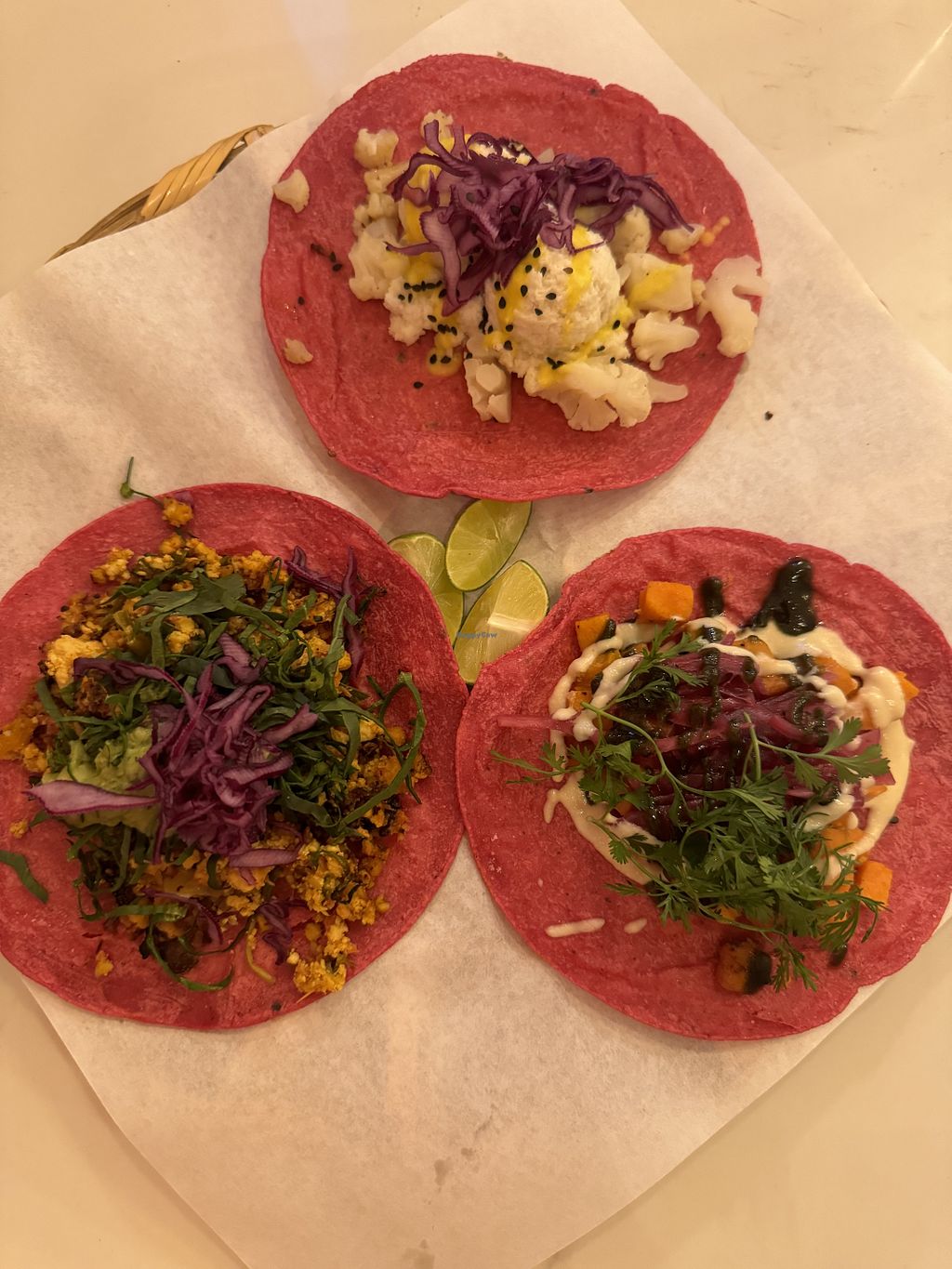 Al pastor, tofu, and cauliflower tacos on the left, tacos en bajo on t…