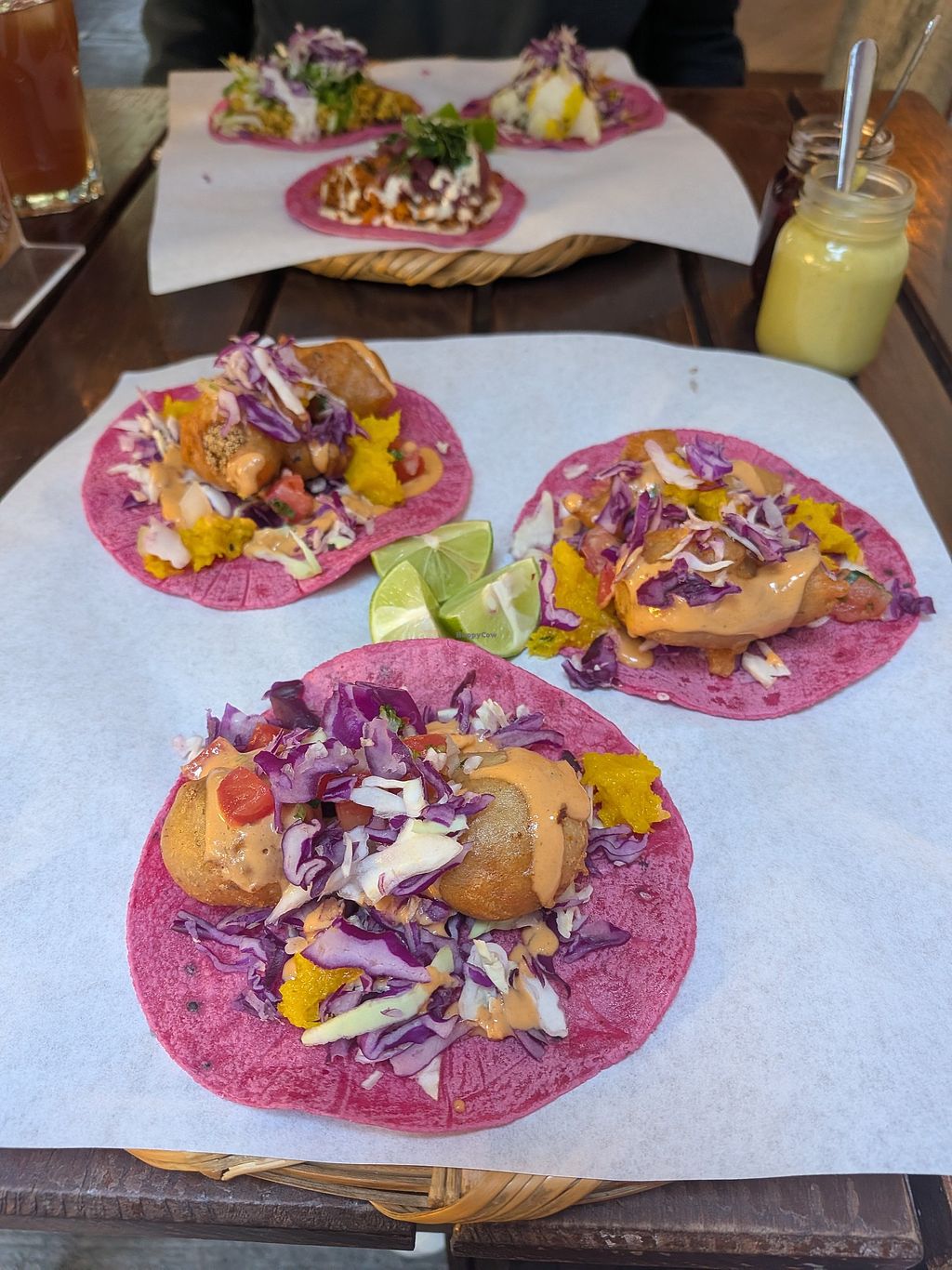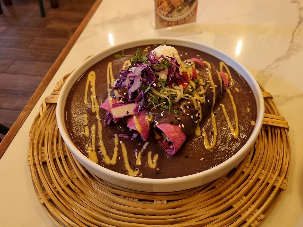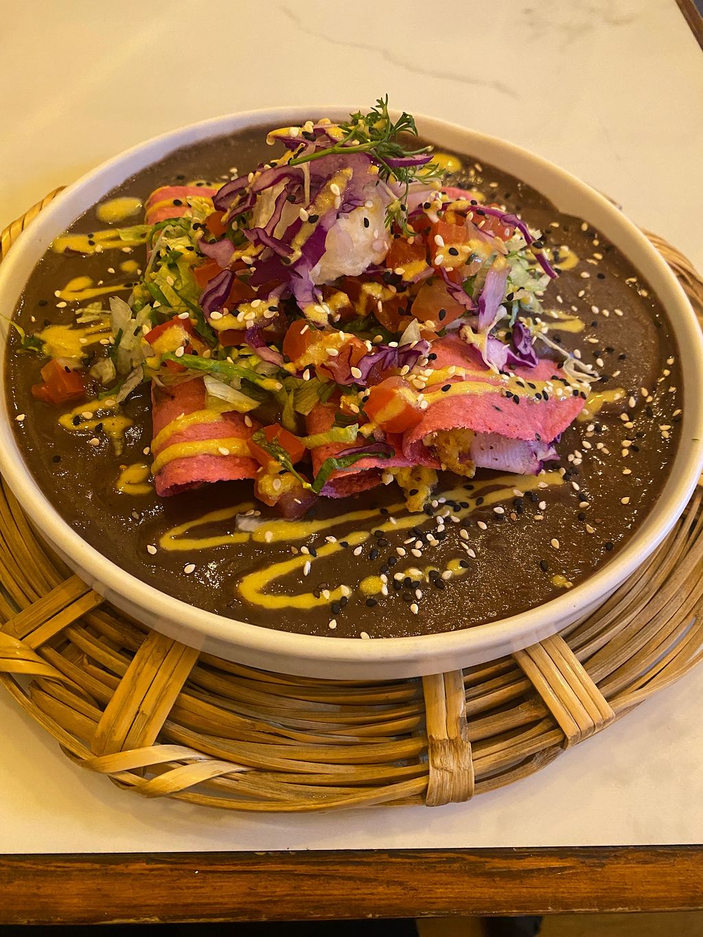 Enfrijoladas - frijoles negros cremosos sobre tortillas rosas rellenas…