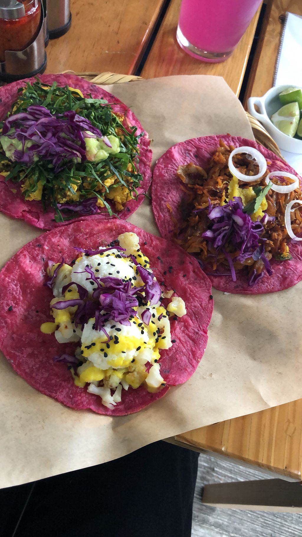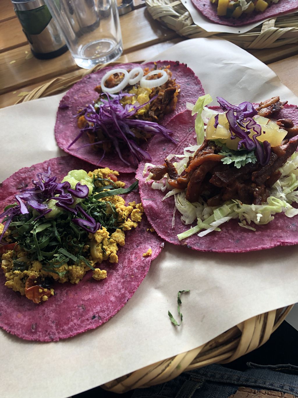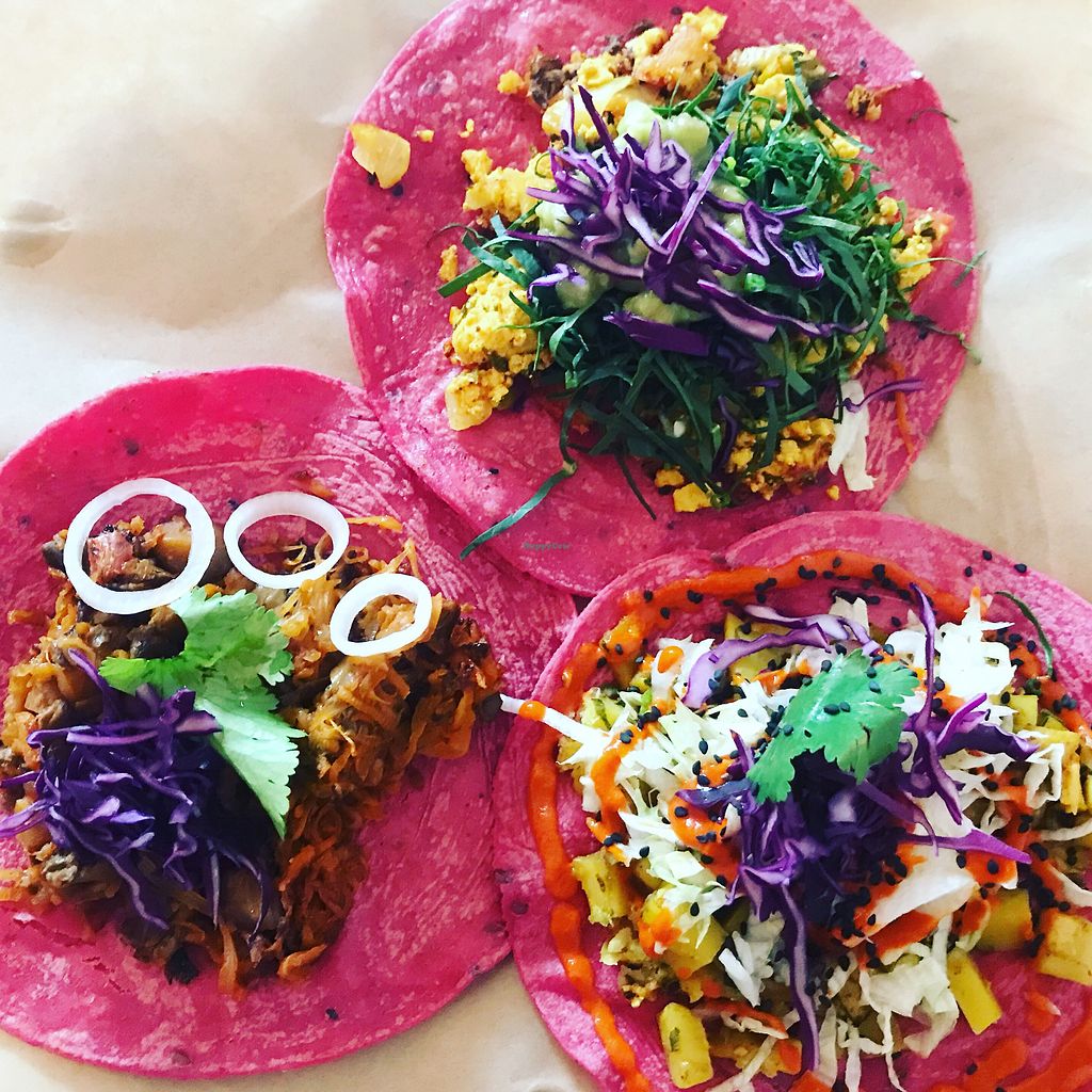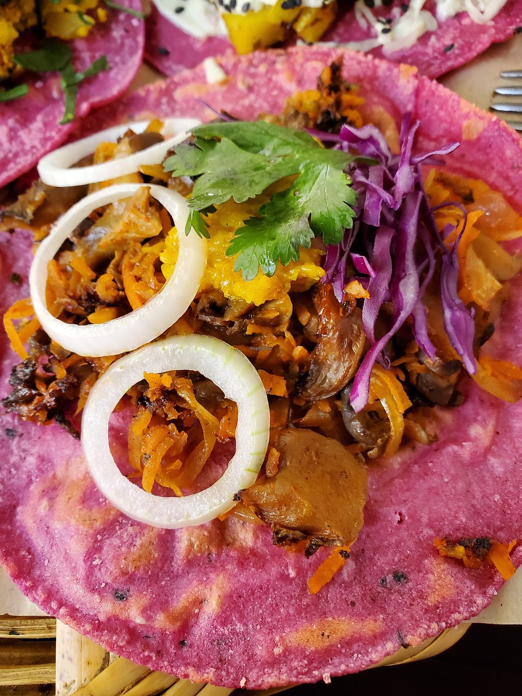 Tacos de machaca tofu, pastor de setas y papas al curry