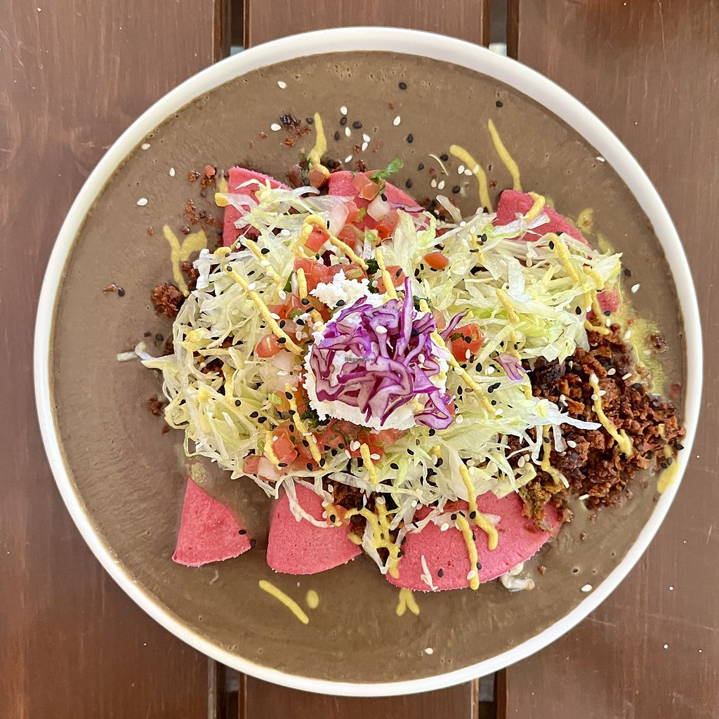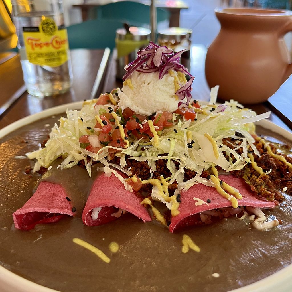 Enfrijoladas (filled with almond cheese and plátano) with vegan choriz…