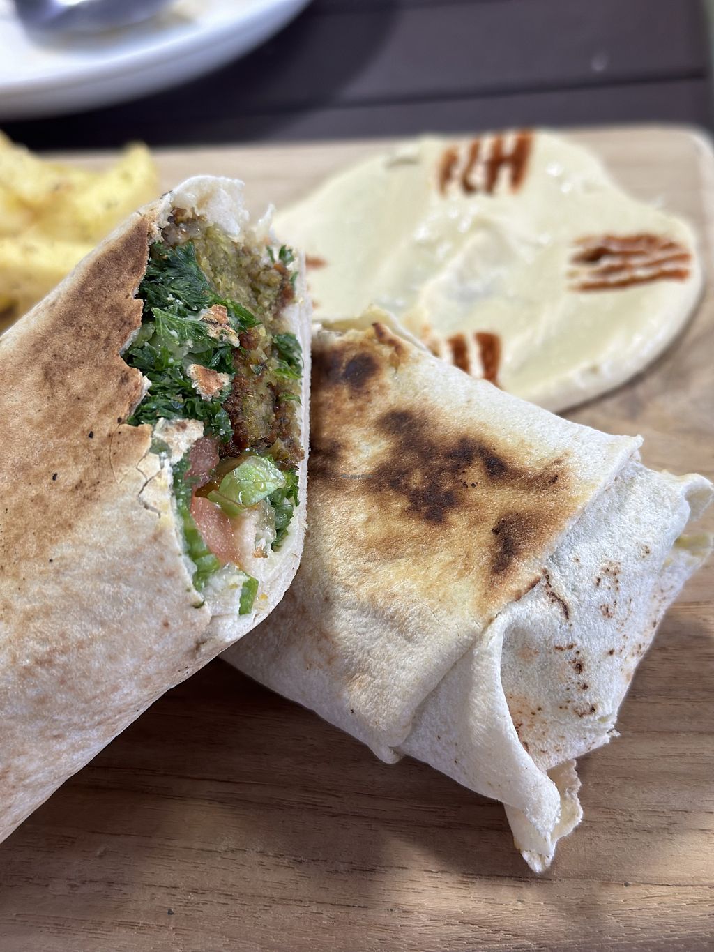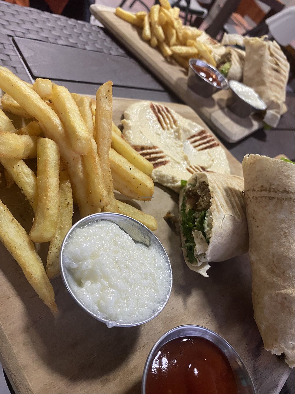 Best baba ghanoush I’ve EVER HAD!! (Not on the menu, just ask!) really good fattoush salad and the vegan falafel wrap comes with creamy hummus and delicious chips. All really good prices and the best choice for vegans in David. Lovely owner, service is a bit slow but they are really friendly.