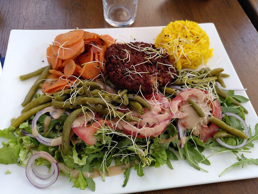 We had the assiette végétale and the Burger végétale without cheese. The plate (assiette) was pretty good, all vegan, just a little bit more salt or other spieces could have been great. I was disappointed about the burger. It came with a bit of !cheese! , otherwise delicious, I really liked the burger pattie. The fries were not salted and really oily. We waited such a long time to order our food and the stuff seemed really unmotivated.
