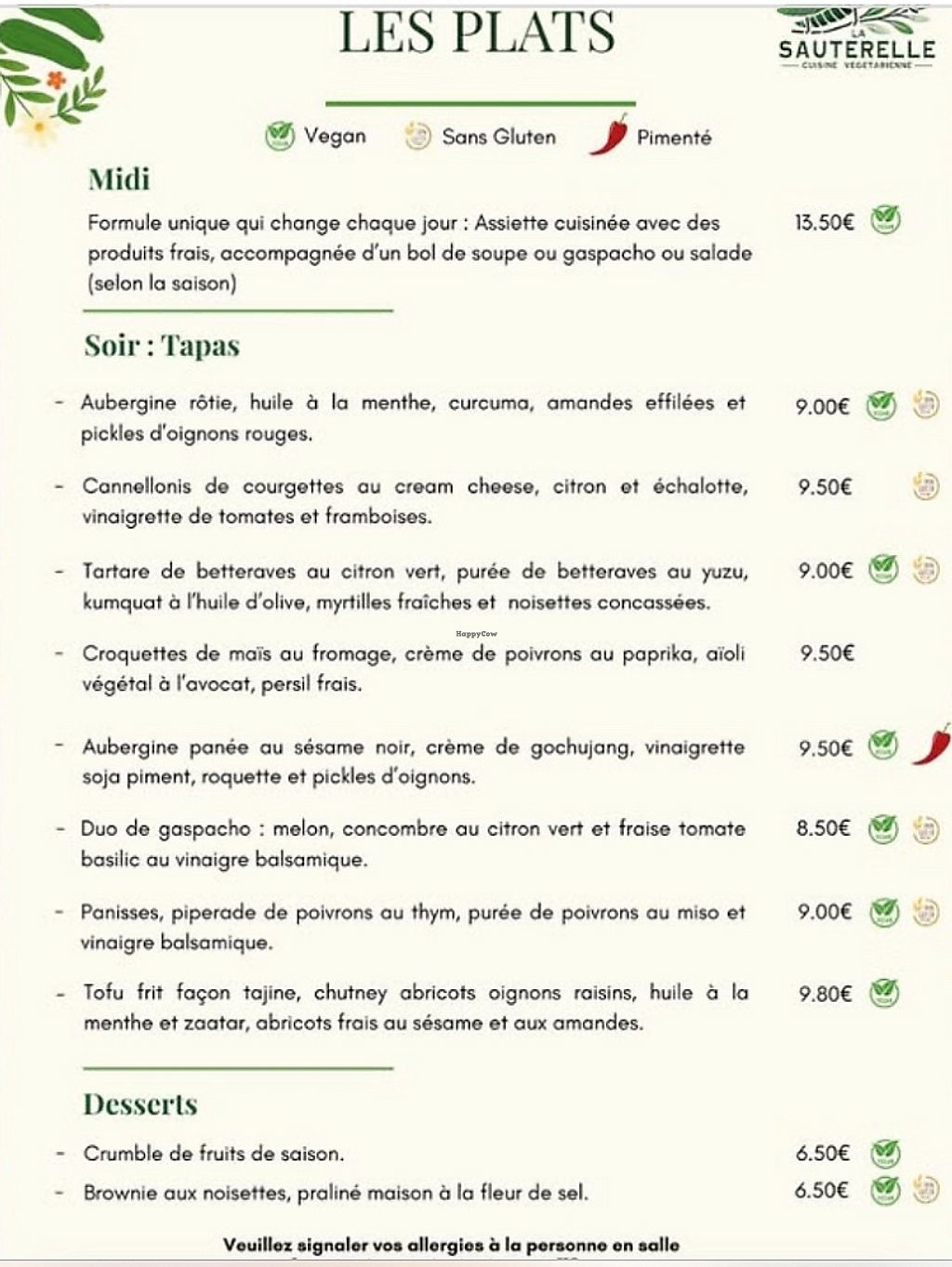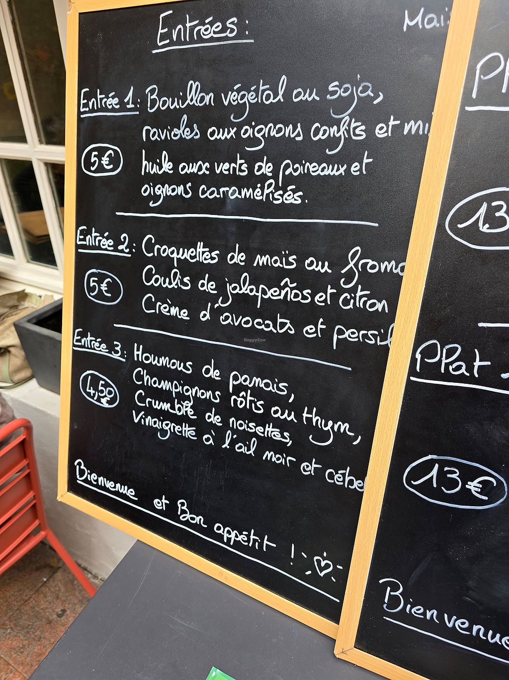 This is a small but pleasant restaurant on two levels, serving mainly tapas. There were four vegan options - sadly they had run out of the soup when we arrived at 8.30pm but it was a Saturday evening and they were very busy…. The staff are just lovely and were rushing around, running up and down the stairs - but still managing to keep a smile on their faces. We ordered 4 vegan tapas, 3 of them arrived within a reasonable time but the 4th didn’t arrive at all, after 40 minutes of waiting, even though the waitress insisted the dish would be arriving soon. Eventually another server told me it would take another 5 minutes but by that time I’d lost my appetite for it, so decided to cancel that part of the order. The staff member was sympathetic and understood my position, finally apologizing (not something I’ve noticed most French people generally like to do) and explaining that they had only opened a month ago and were still having “teething” problems. The three dishes we did have were very tasty, but very “fried”, so just be aware that it’s not for the healthy-minded vegan!