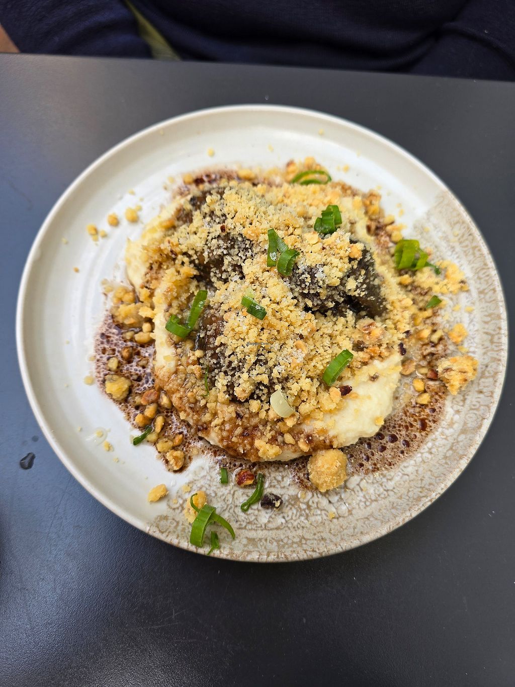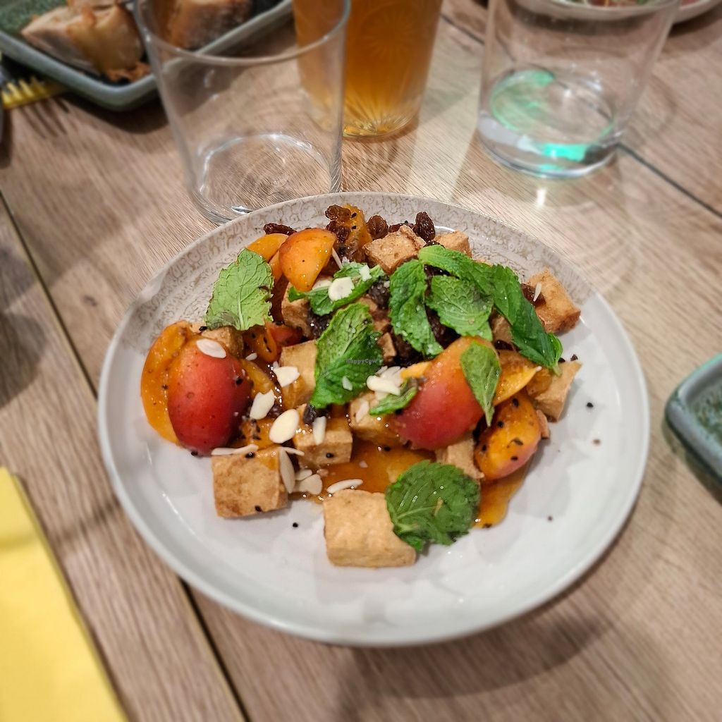 Read moremostly vegan restaurants on our holiday in Toulouse. Towards the end of the week we were running out of options and my husband chose this place. I was not disappointed. It was evening time and most of the dishes were vegan. We had 4 dishes to share, a dessert each and an Armagnac each to try. It was a real treat. We sat in the basement but there was a choice of three areas to sit including on the pavement. It is a lovely little traffic free street and I’m sure sitting outside would have been lovely but he was in shorts and didn’t fancy it. Each dish seemed carefully constructed with lots of elements. The desserts were amazing. The crumble was a slice and served cold and was very sweet. The brownie was also a slice of something larger, much better than the usual brownie square. Recommend.