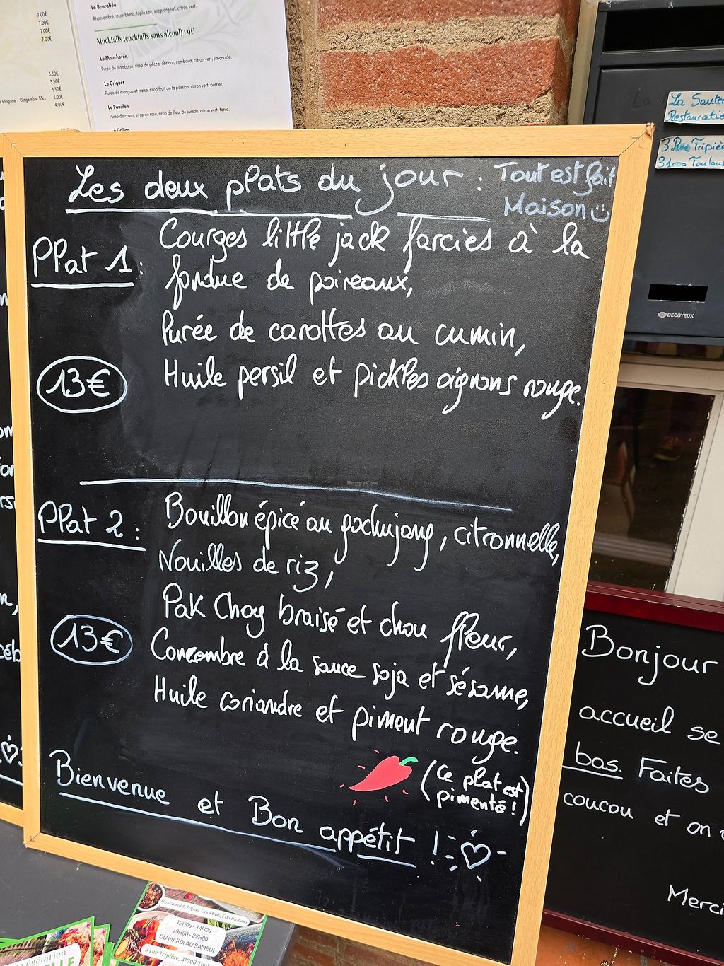 Le soir la carte propose un système tapas, l'équipe conseille d'en choisir 2 et d'ajouter éventuellement un dessert 😋. Environ la moitié de la carte est vegane, on en veut davantage 😁🌱 ! Les plats végétariens pourraient facilement devenir vegans. Le lieu est super : une petite salle à l'entrée joliment décorée sur le thème de "la sauterelle", avec une pointe d'humour. Des escaliers mènent à une autre salle, dans un sous-sol en briques, magnifique, typiquement toulousain. L'équipe est très gentille et accueille avec beaucoup de sourires 💚
