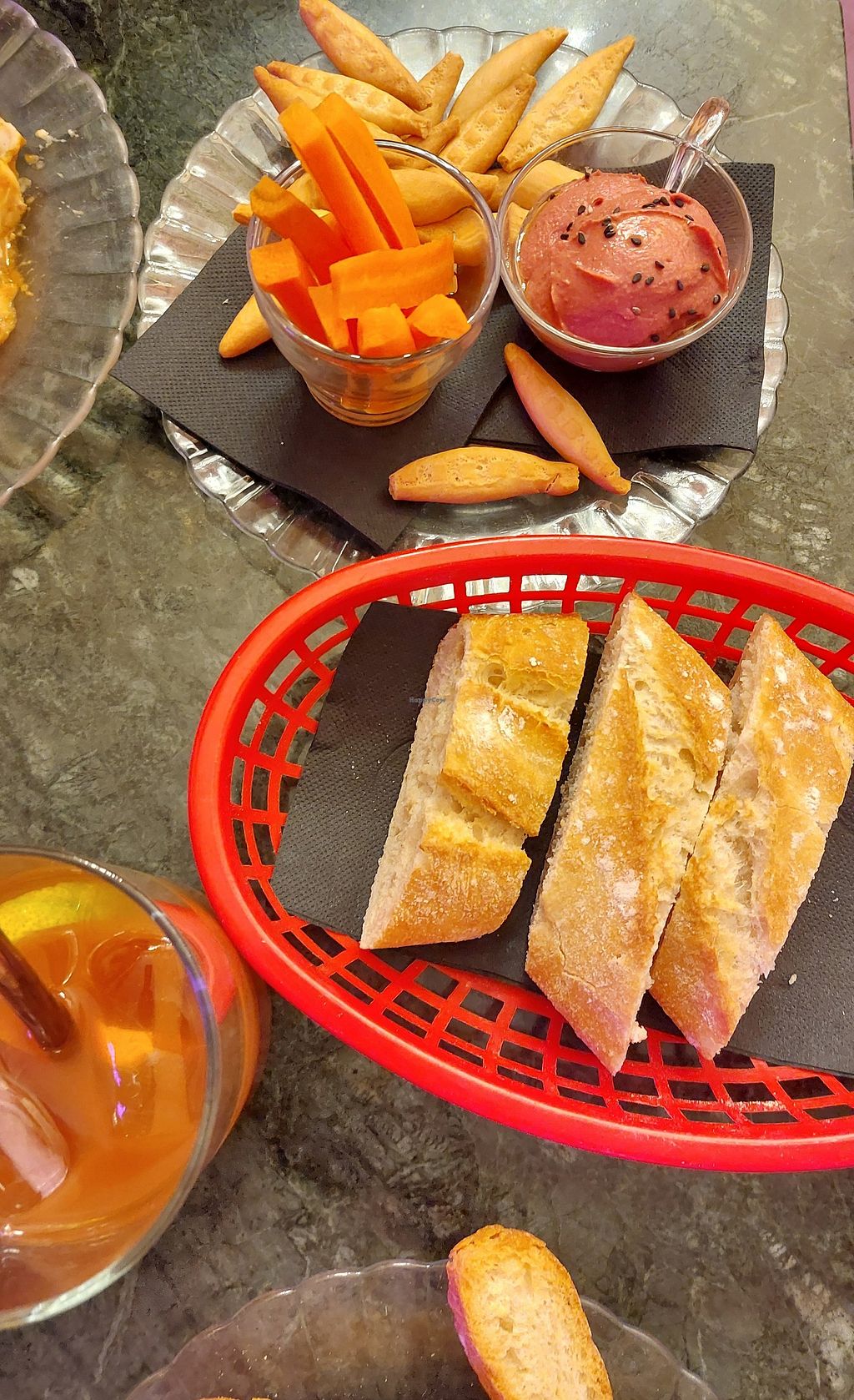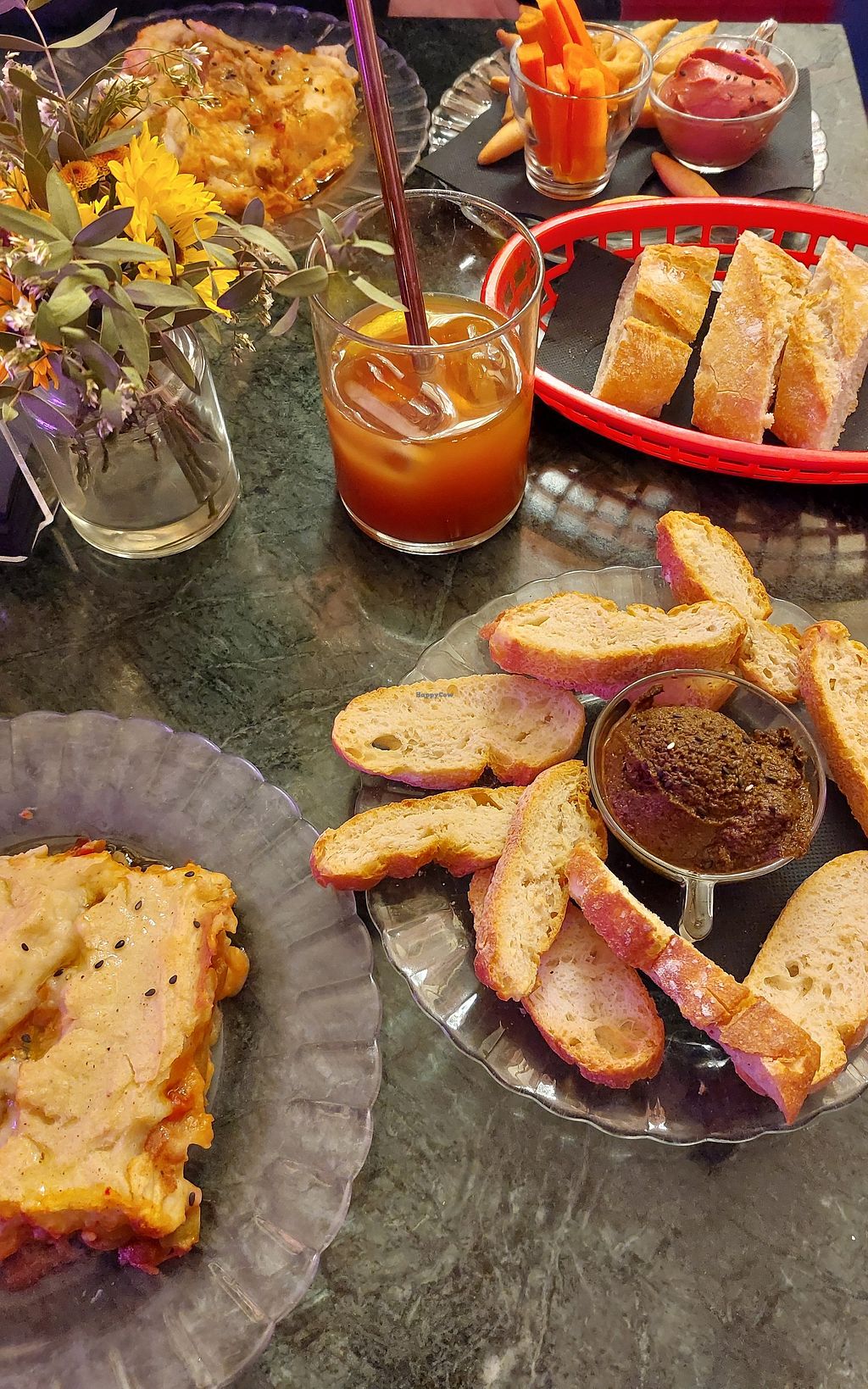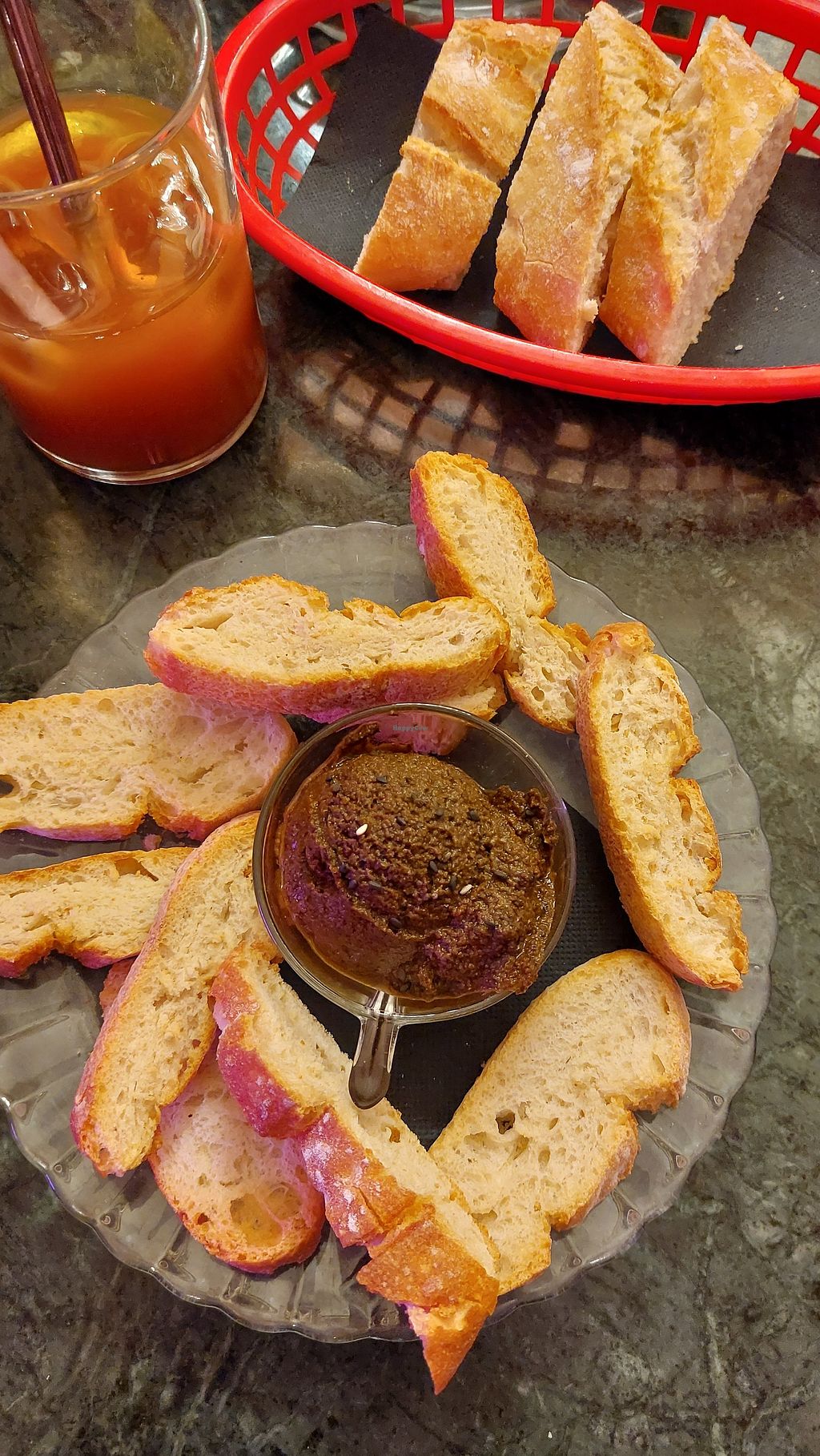 Wir hatten die Pastel de Patatas, die sehr lecker waren und einen Oliven, sowie Hummus Dip, die beide ebenfalls sehr gut geschmeckt haben. Leider war das Brot zum Oliven Dip sehr trocken. Das andere Brot war im Gegensatz schön weich und hat geschmeckt. Außerdem war der Infusion fría mal etwas anderes im positiven Sinne. Insgesamt war es für einen Snack sehr gut und mal was anderes. Die Einrichtung war sehr gemütlich und der Aufenthalt angenehm.