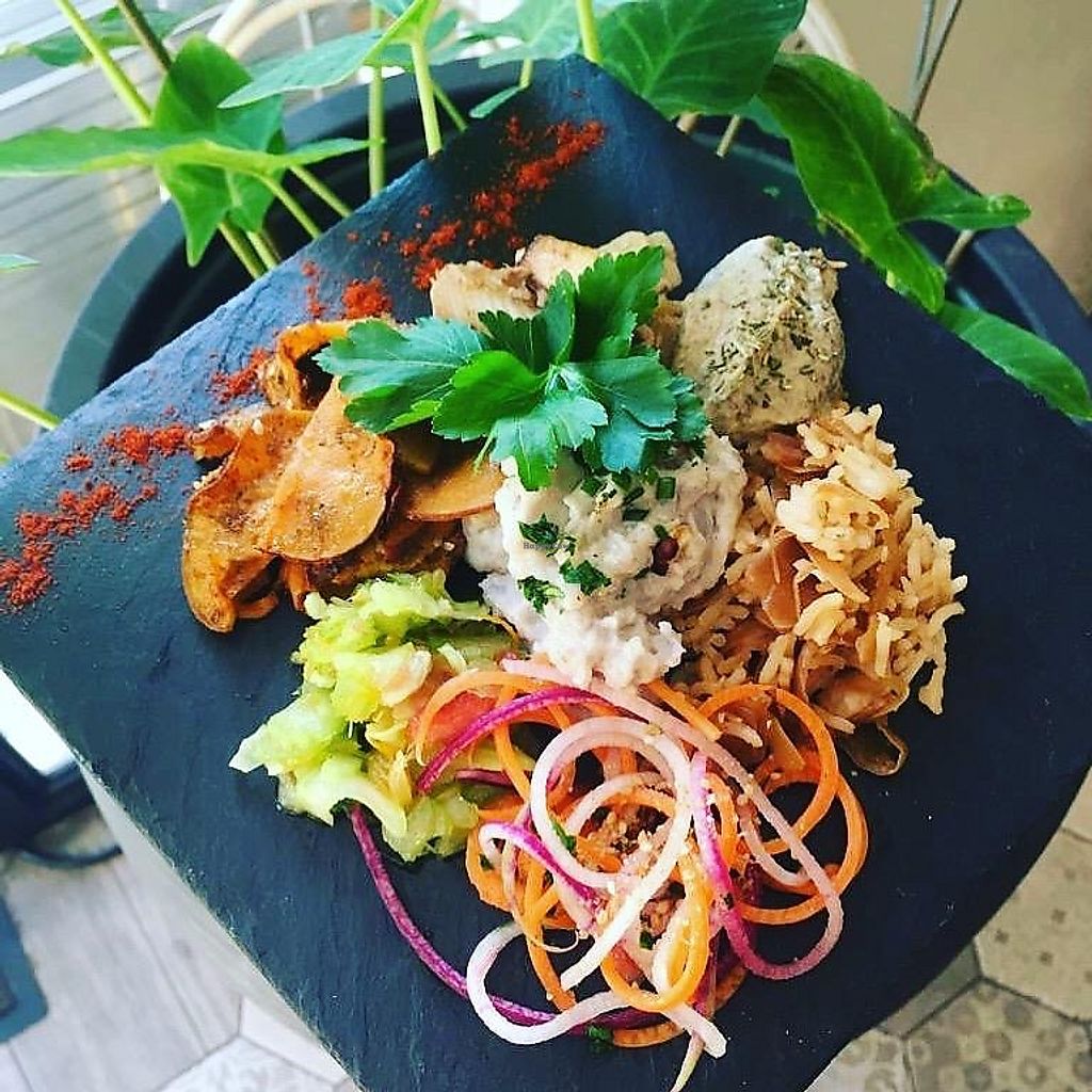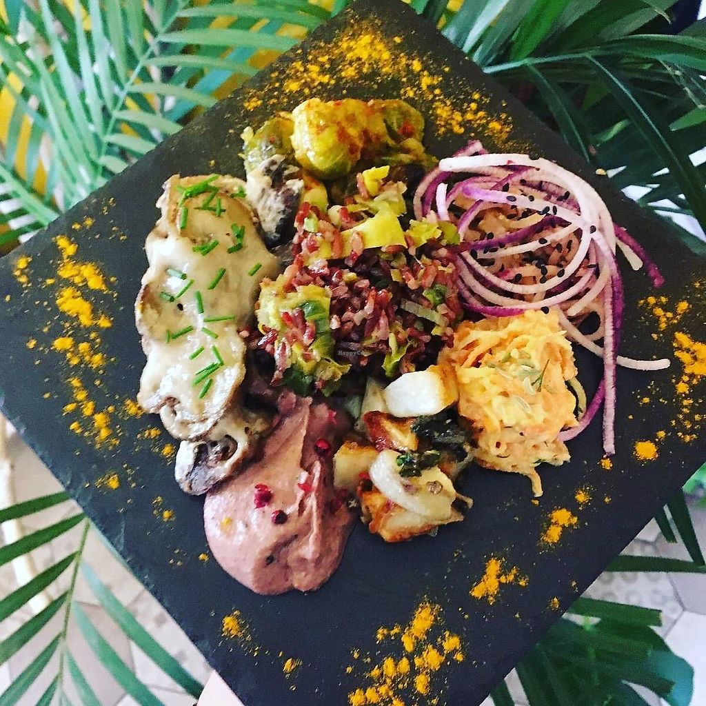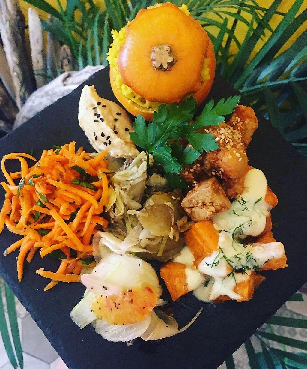 Black rice and veggies, roasted tomato, salad and panisses (local spec…