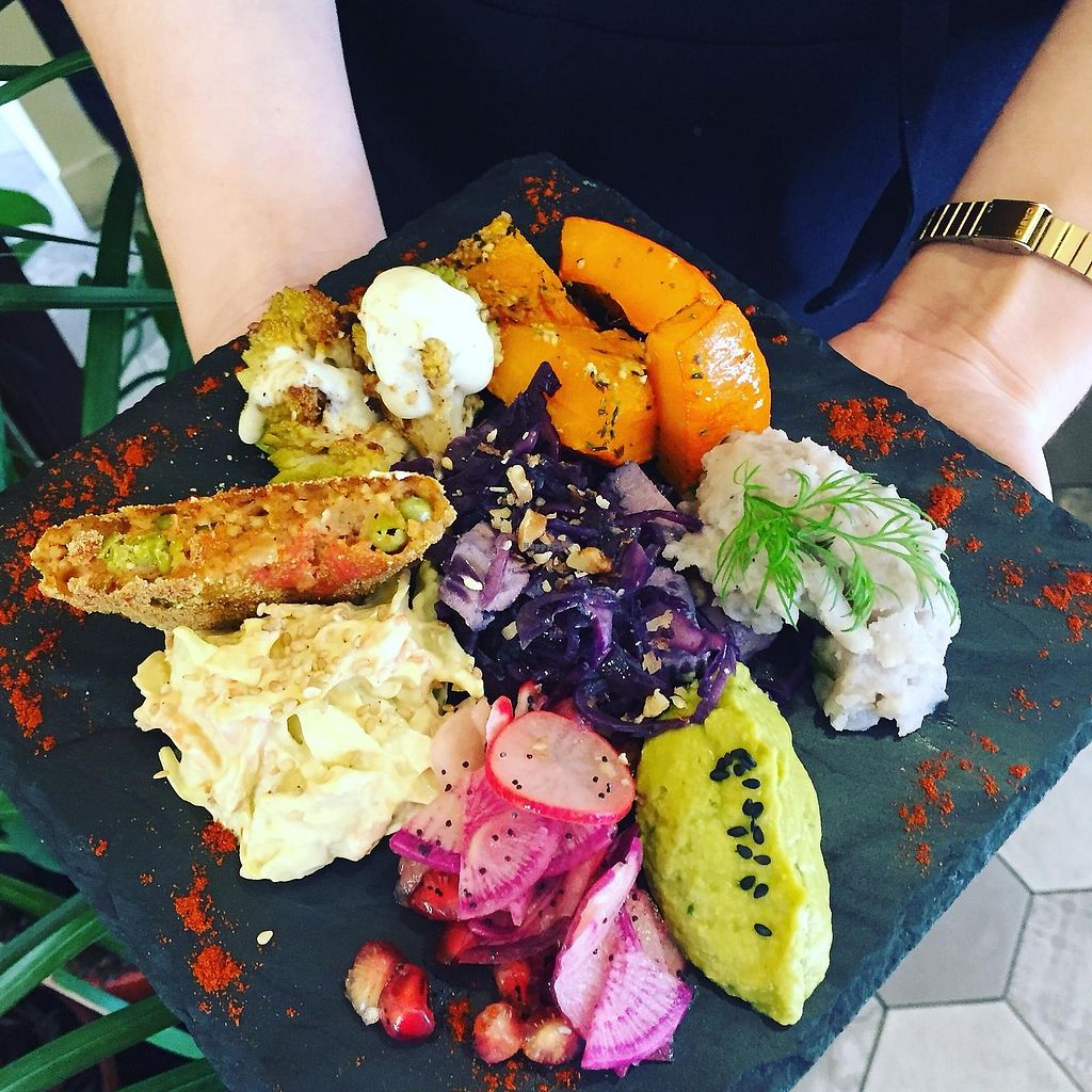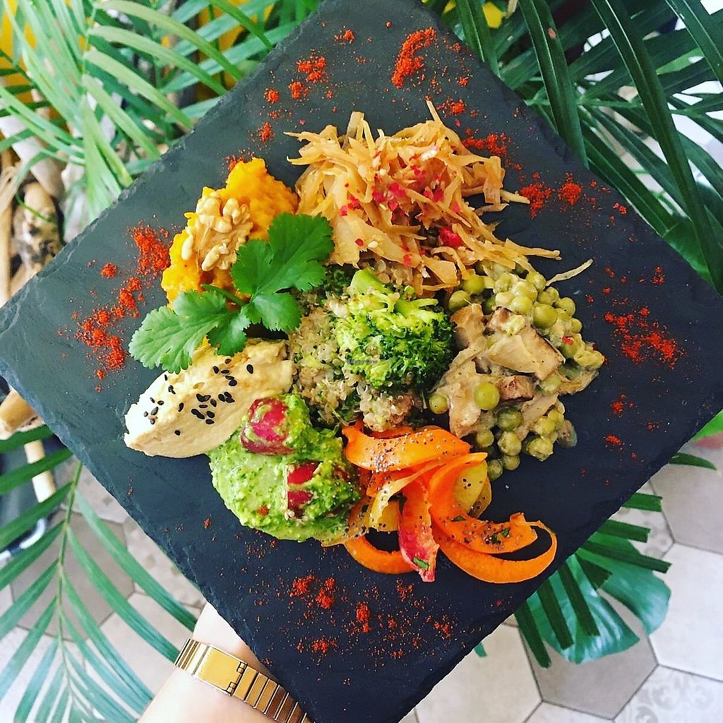 Pâtes au pesto, pdt à l'aoïli, curry de tempeh, caponata et jus pastèq…