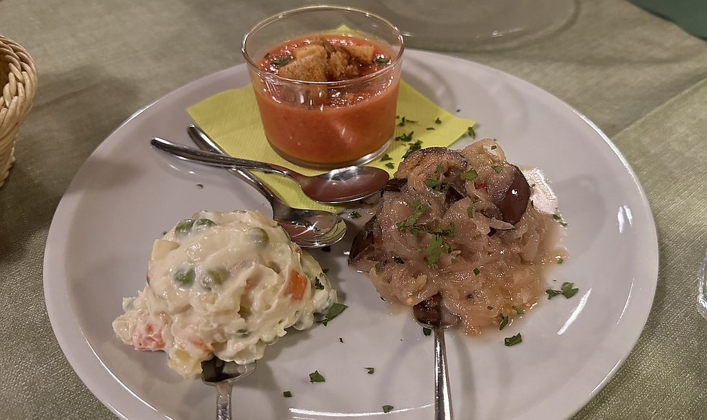 Tris di antipasti (zucca in saor, hummus, insalata russa)
