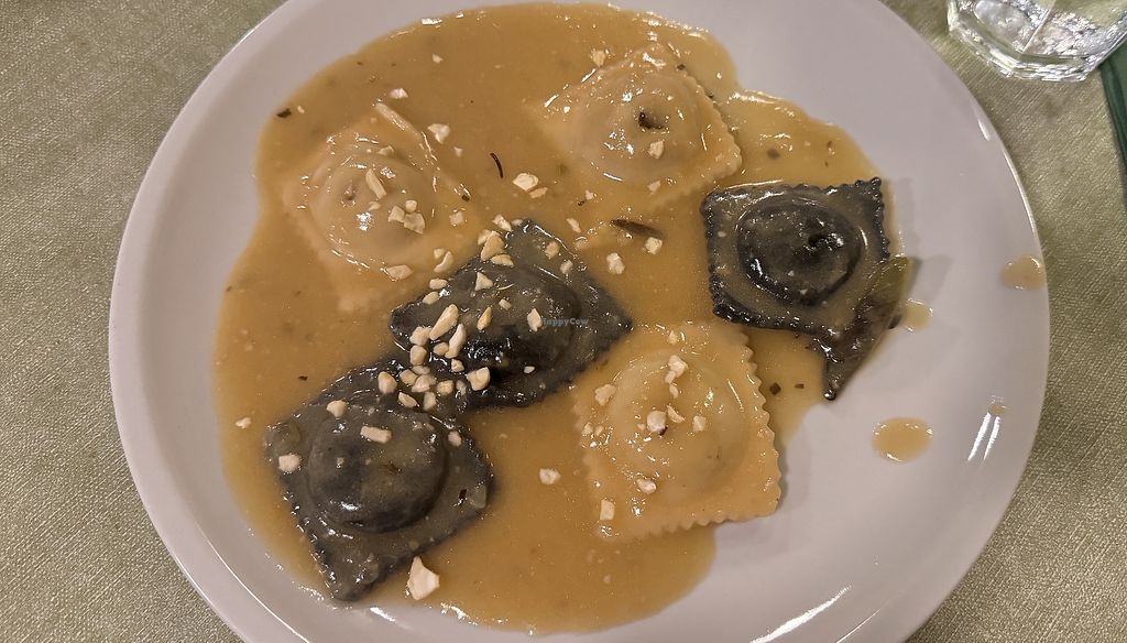 Black and white ravioli with funghi and seitan filling and cashew sauc…