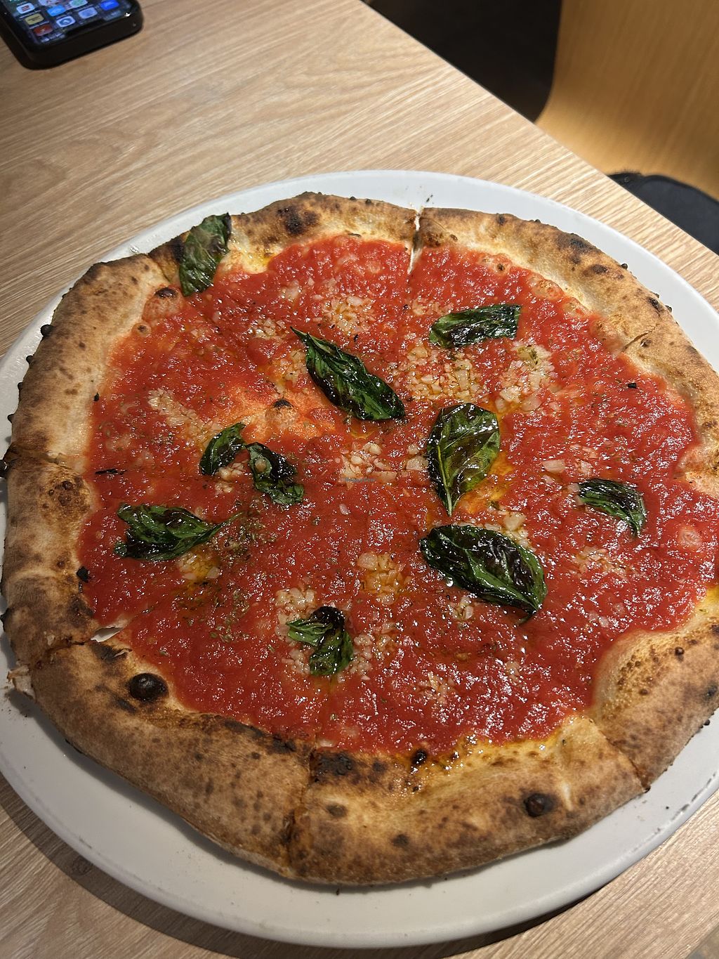The pizza was better than most pizzas I ate in italy. Very yummy! I had the magherita with buffalo mozzarella (so only vegeterian, not vegan). The high price was definitely worth it!