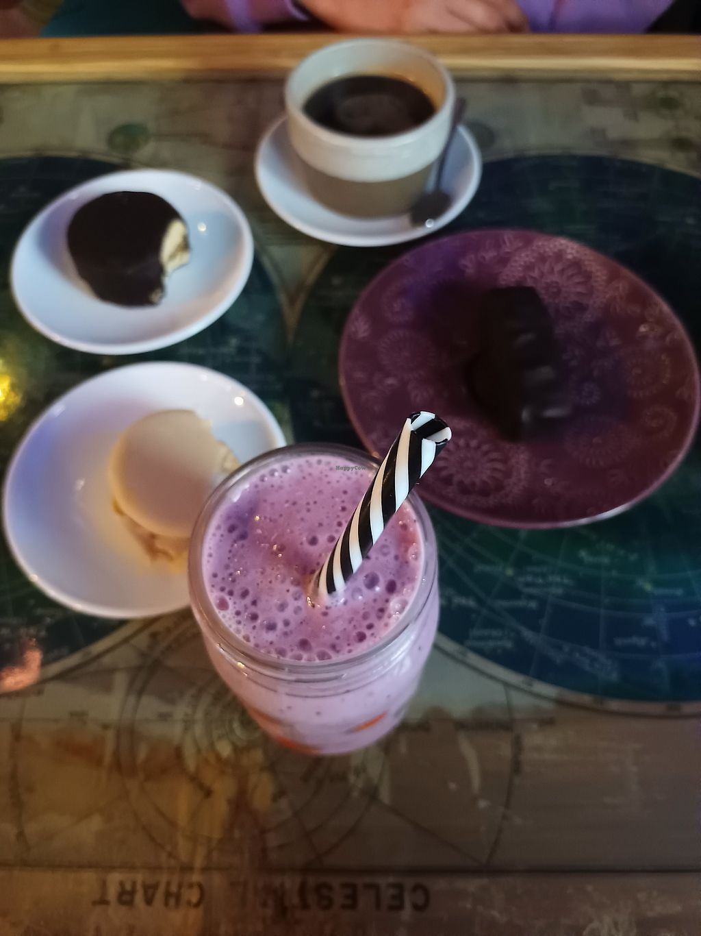 Read moreTomamos café y batido de frutos rojos. Tiene varias opciones dulces sin gluten, de éstas probamos los alfajores y la barra Snickers y estaban absurdamente deliciooosooos.
