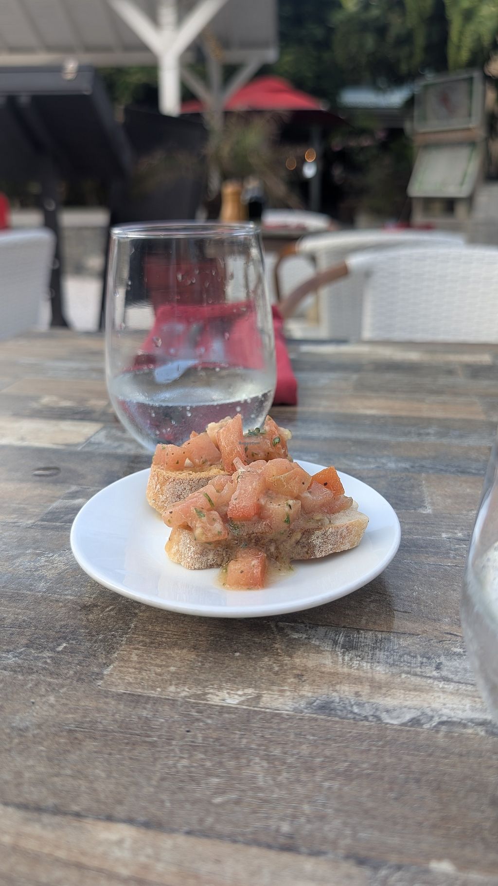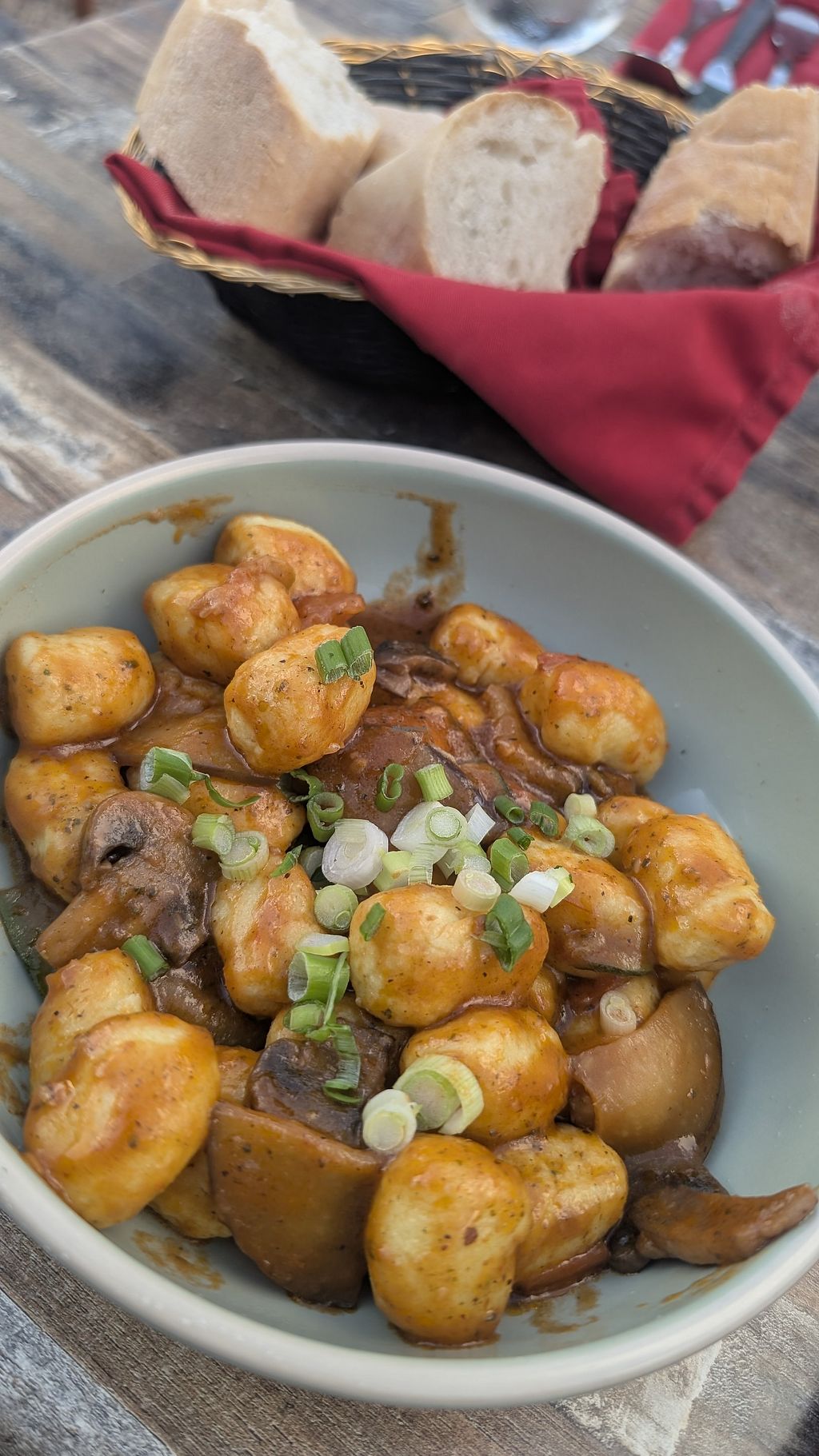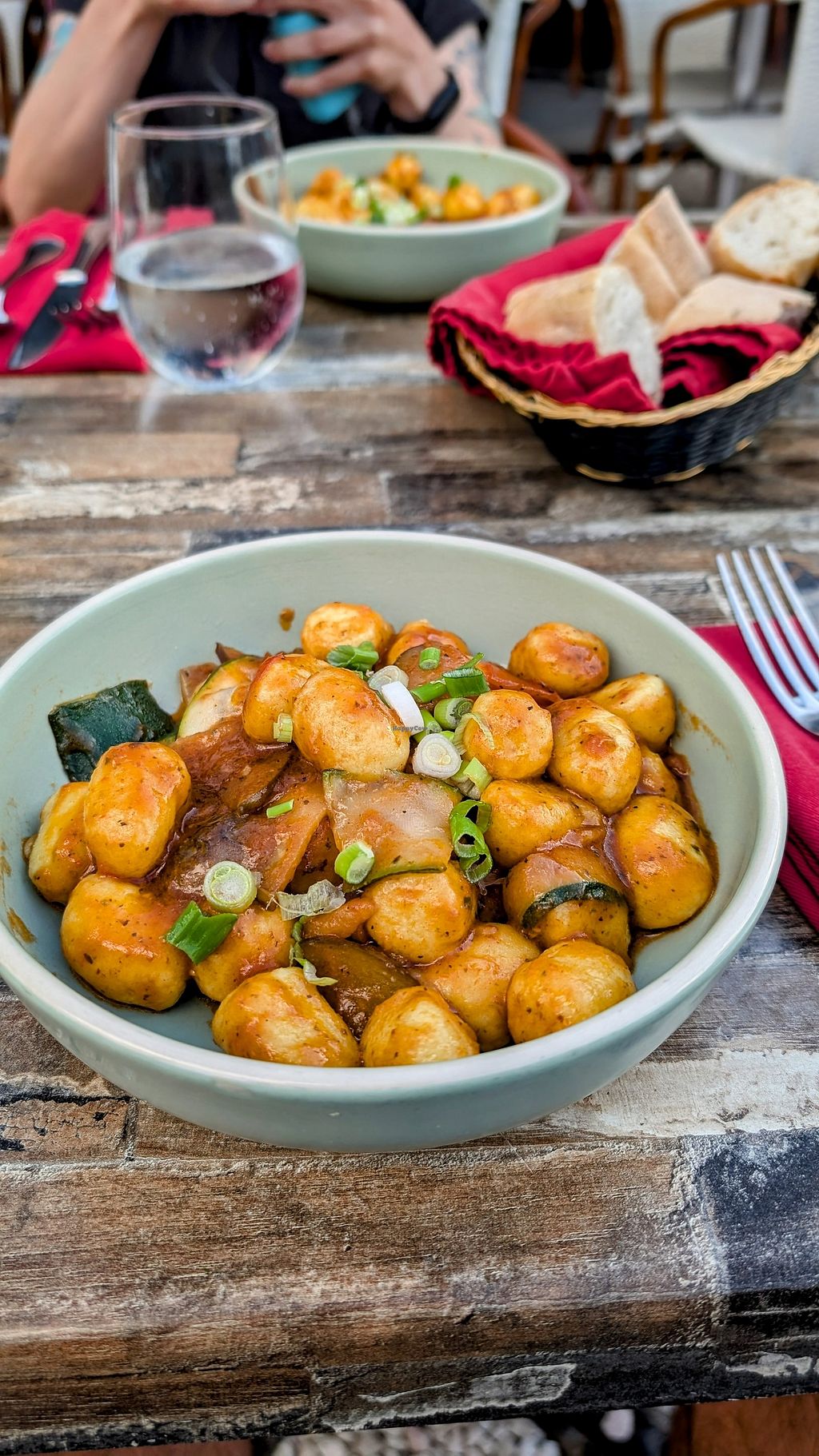 Charming little village with lots of restaurants, live music and local arts/crafts for sale. Restaurant was very busy, service was noticeably slow. One vegan option on the menu - gnocchi. It was good - gnocchi in a ratatouille-like sauce. They had sorbet for dessert, which I did not try. Good to find somewhere with a thoughtful option.