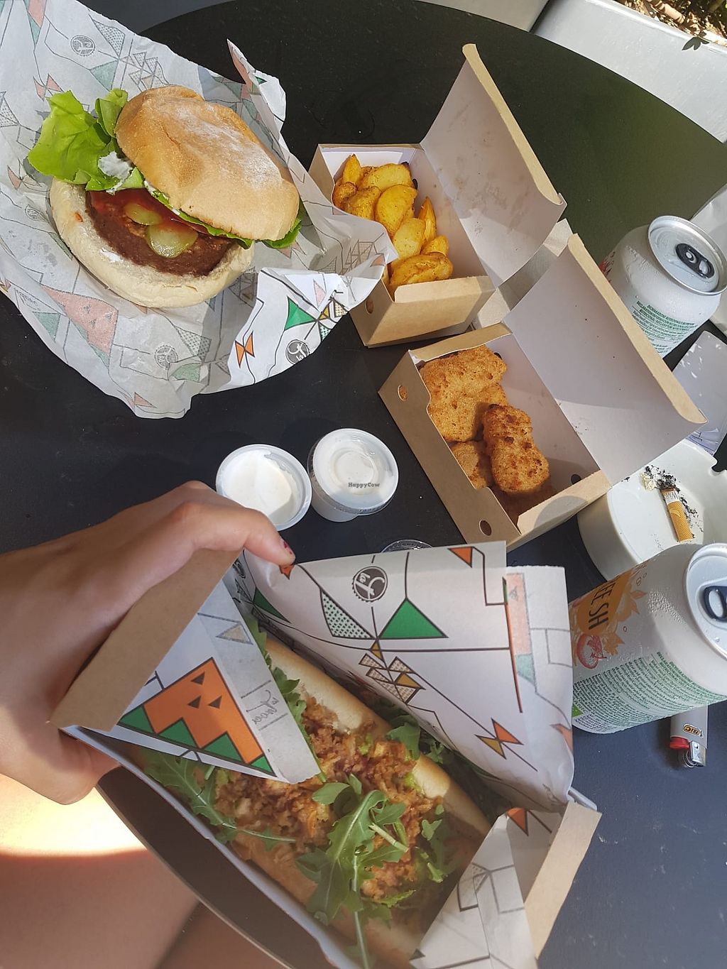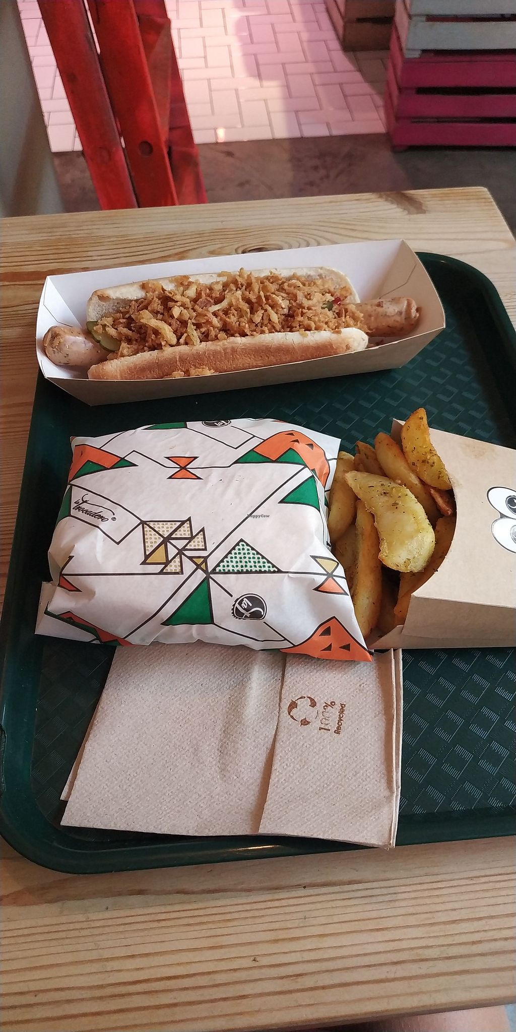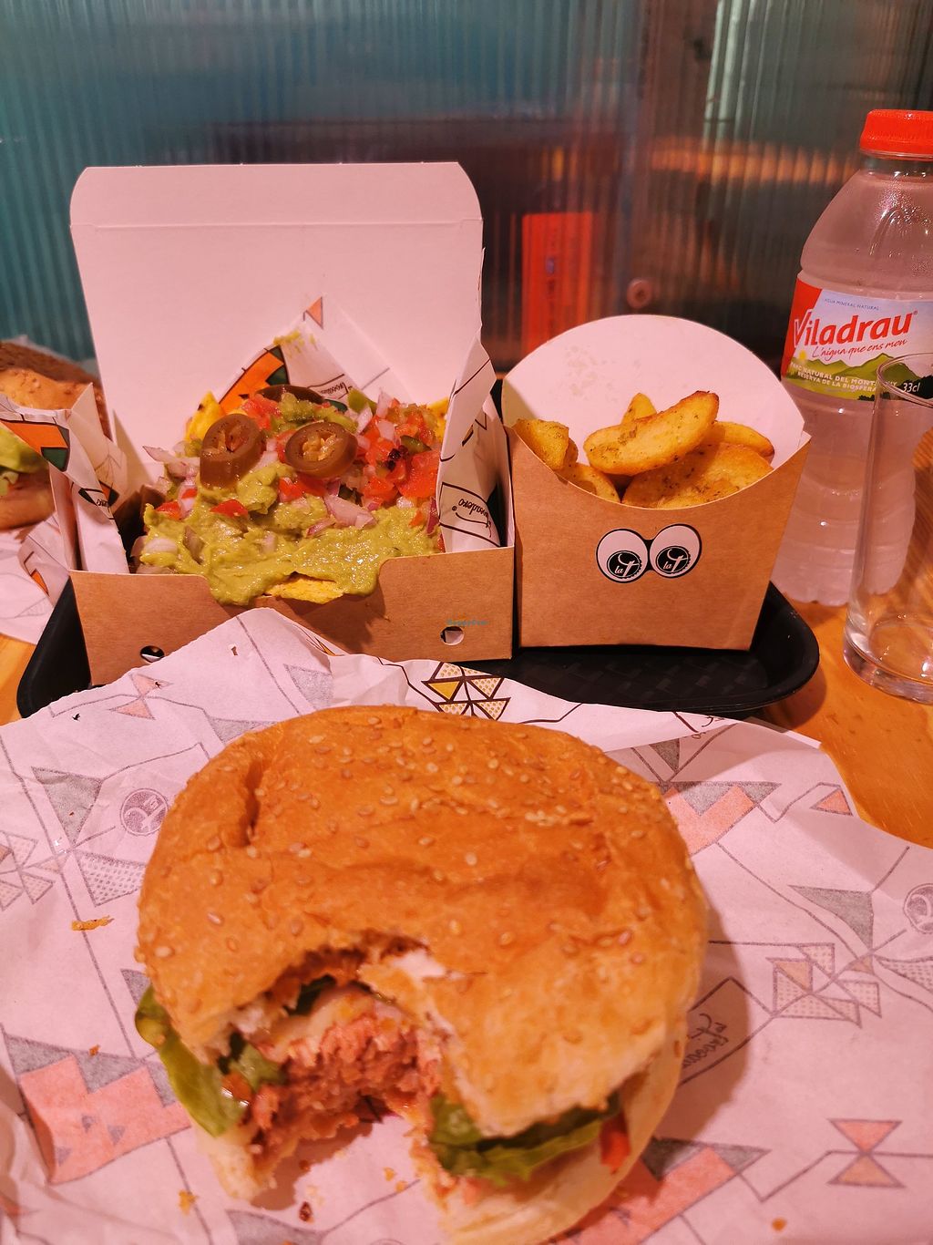 Perrito caliente clasic, hamburguesa de pollo vegano y patatas deluxe