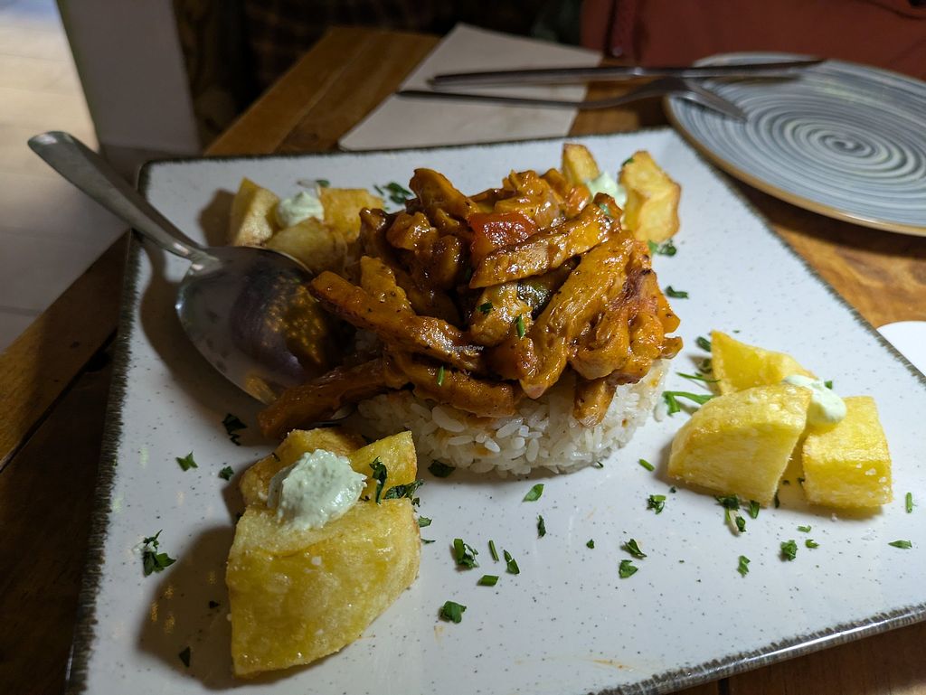 I’ve been visiting Cádiz since the 1990s and remember what a breakthrough La Veganesa was, first as a stall in the Central Market and then as a full restaurant with an extensive menu in the ancient Barrio del Pópulo. Cádiz, a traditional city that reveres the fried fish, was slow to come to plant-based dining. This place smashed down the barriers. We returned recently for the first time since 2019. We shared an appetizer of garlic mushrooms, then split two mains: barbecue seitan and chickpea curry. All were tasty and well-presented, though heavy on the salt. The best thing we ate was the mango flan.