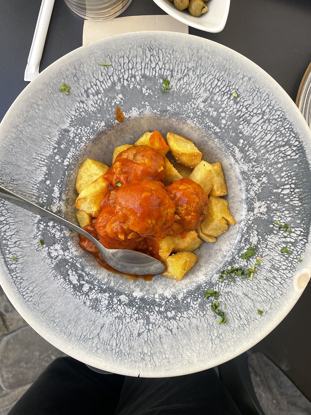 Not 100% vegan but I was happy to find traditional food like tortilla and meatballs, it was all really tasty! Maybe the tortilla could‘ve been a bit more moist and the staff a bit more polite but I would definitely go back to try the rest of the menu! Lovely views on the Cádiz streets when you sit outside (: