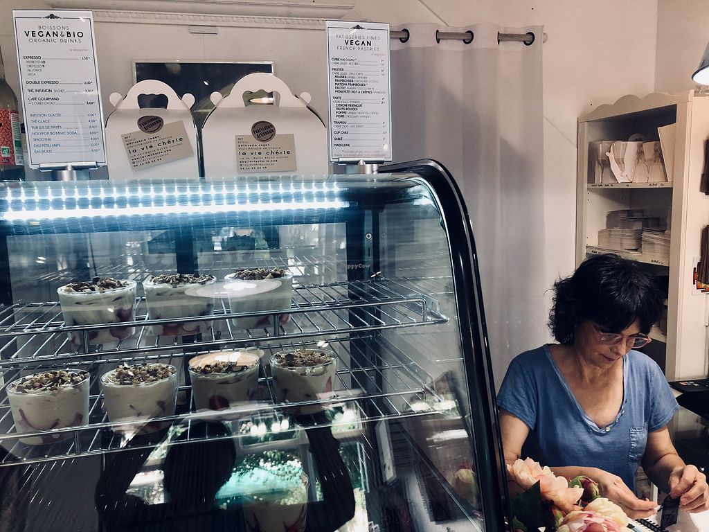 Vegan patisserie (pastry shop) with tarts and cakes and coffee