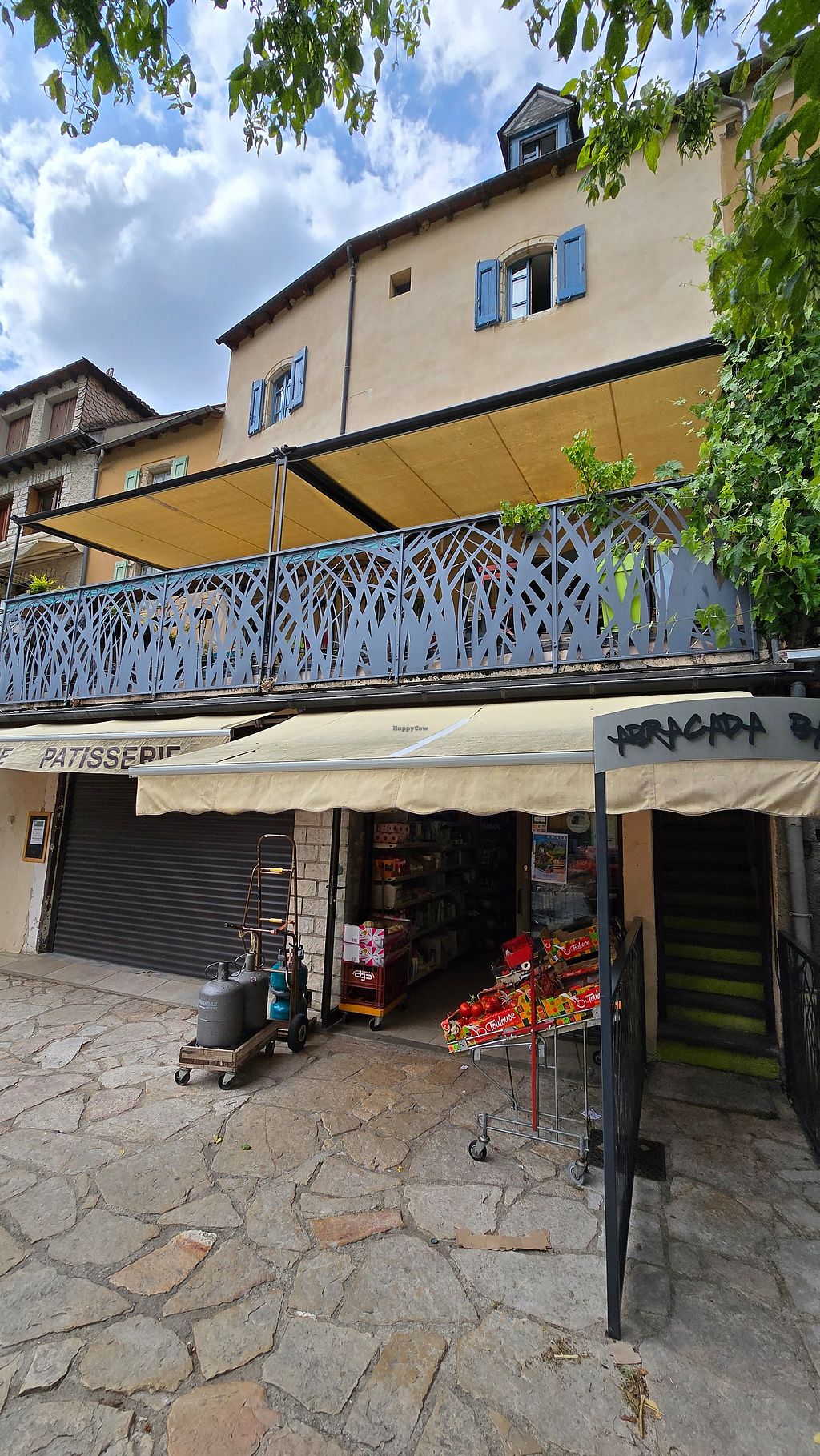 Outdoor seating on the front side is looking at the river. Entrance stairs - next to the epicerie.