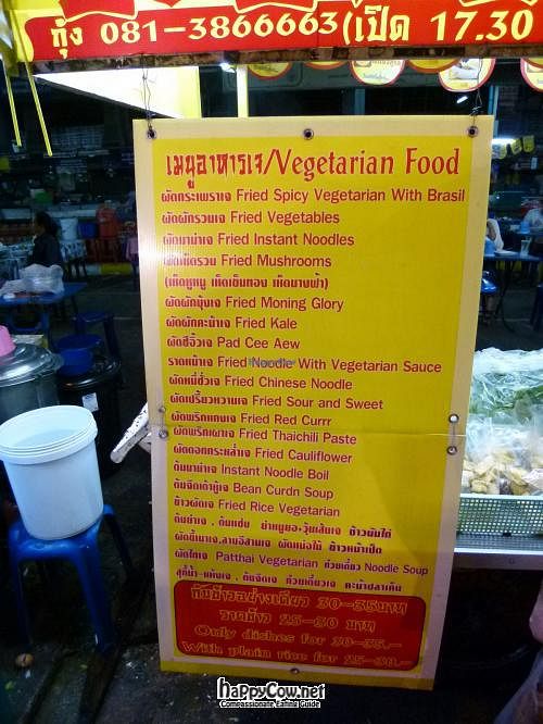 Food cart alongside with other carts just inside Chiang Mai Gate at front of the Chiang Mai Gate Market. No name on the cart so look for the yellow and red Thai signs in the front (means vegetarian). Under new ownership Jan 2017. Reported closed December 2021.