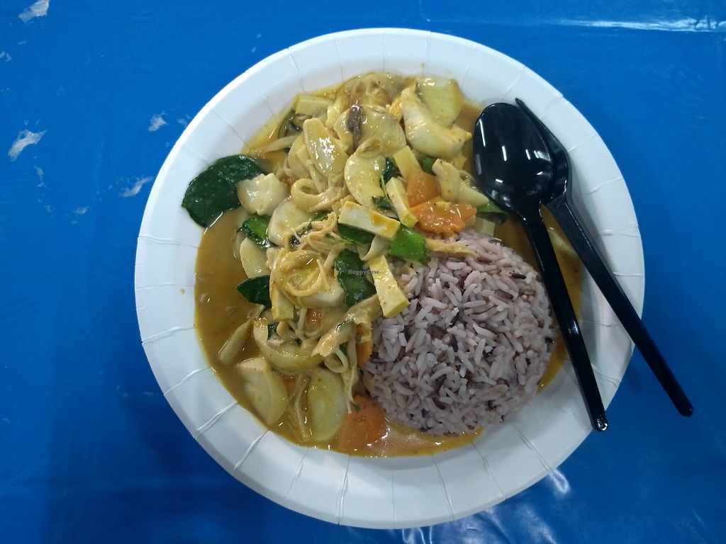 Proper bloody banging this was. Had fry red curry paste vegetables(not spicy) with red rice and a spring roll which was 65 baht!