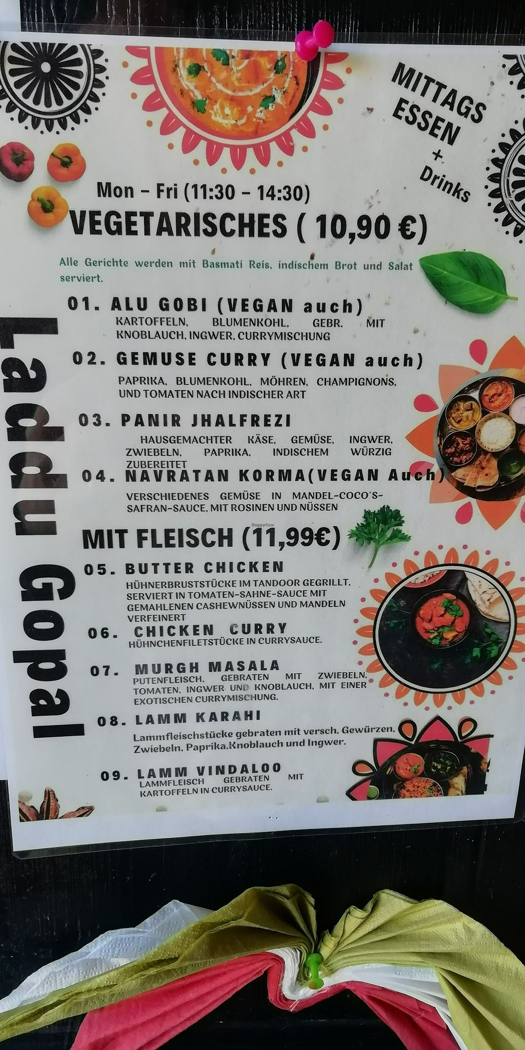 Serves meat, vegan options available. Indian restaurant with vegetarian and vegan dishes. Open Mon-Fri 11:00-14:30, Mon-Thu 17:00-22:00, Fri-Sat 17:00-22:30, Sat-Sun 12:00-15:00, Sun 17:00-22:00.