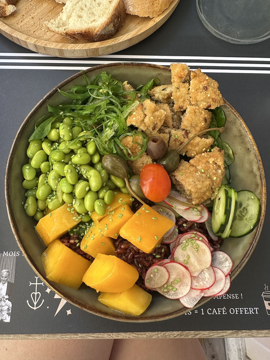 Il n'y a pas beaucoup d'options vegan mais le poké végétarien est vegan et il est délicieux. Pour le dessert, il n'y a pas de choix certifié vegan ; j'ai pris le citron givrée (il est servi avec chantilly, demandez sans). La sélection de dessert autrement est très bien avec des crêpes spéciales, des gâteaux du jour, etc... L'endroit reste sympathique et offre de bons plats.