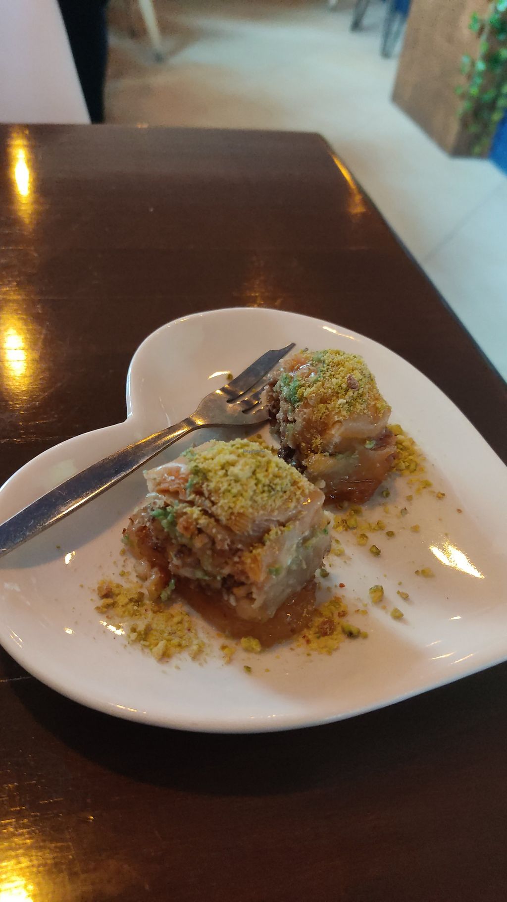 Super tasty tortilla falafel with grilled vegetables. They have sweet cakes and baklava as well!