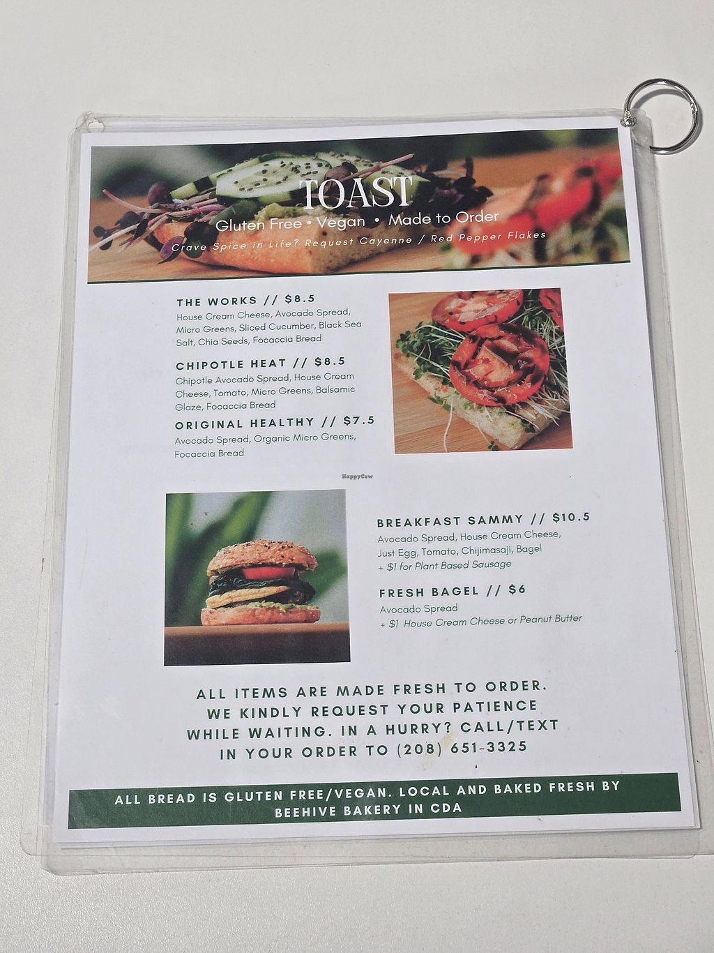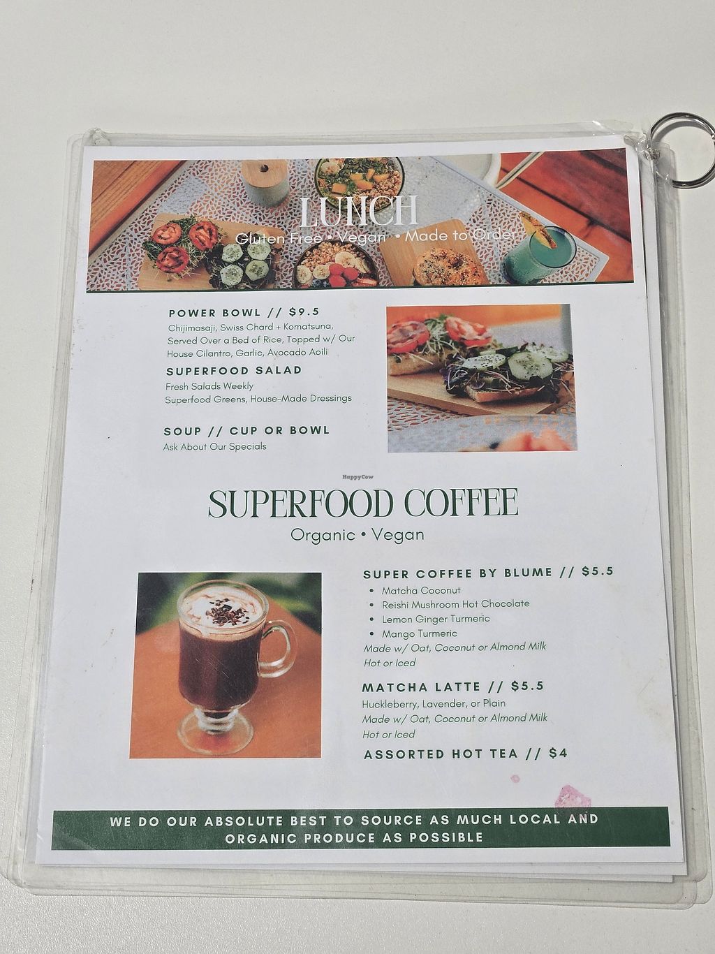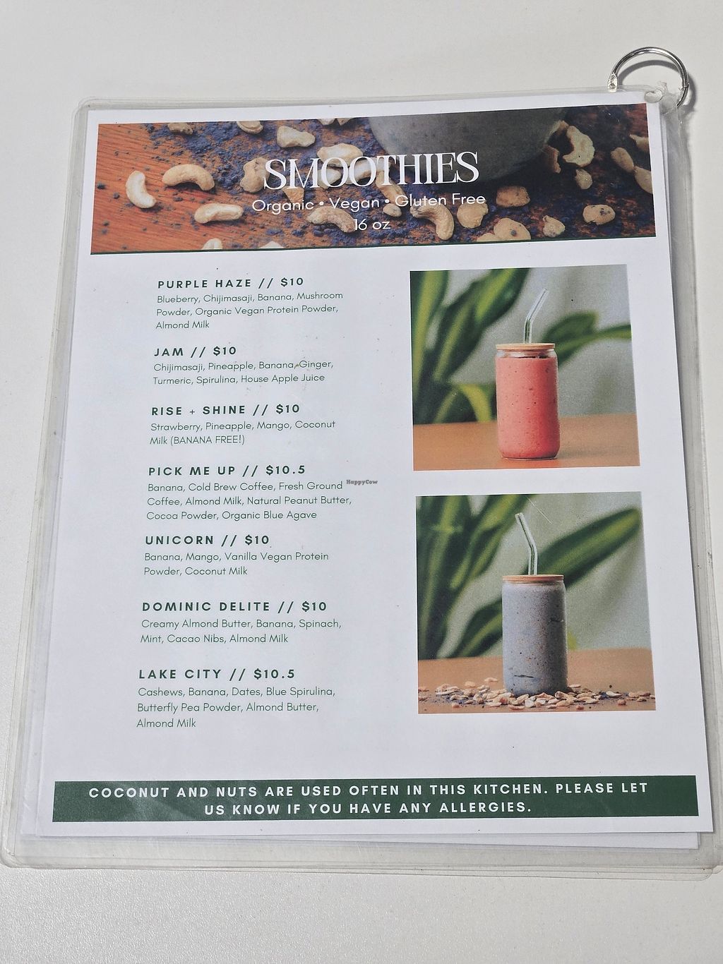Had the breakfast sandwich and Huckleberry matcha latte with oat. Partner had the Buddha Bowl. Sandwich was solid, the gluten-free bread is fantastic. Smoothie bowl was delicious, and matcha latte tasted great. Decent value for the price. If you have nut allergies, you'll want to double-check.