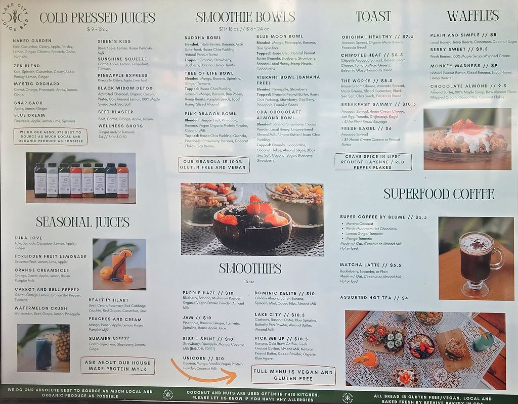 Love the variety of food and juices. It isn’t something I can just whip up at home.. delicious flavors.